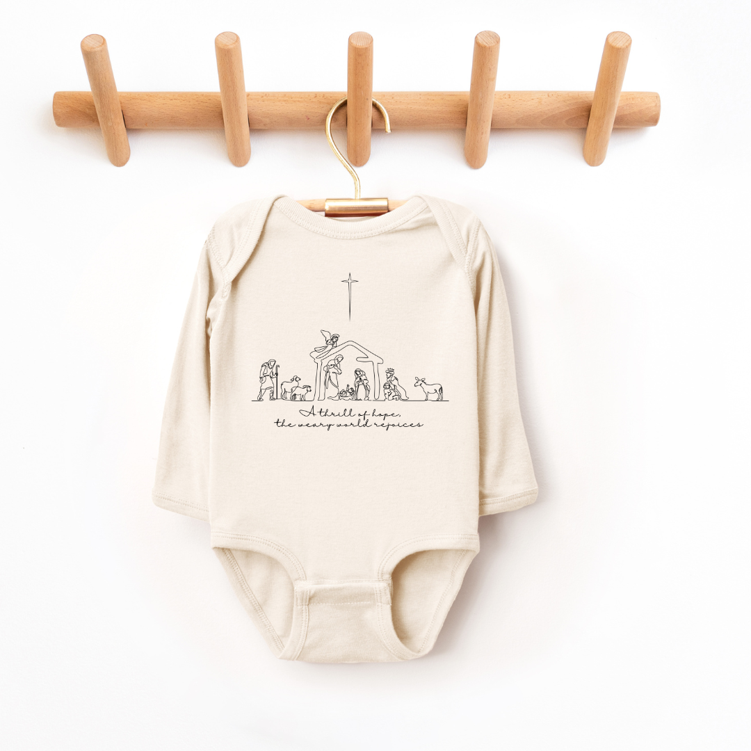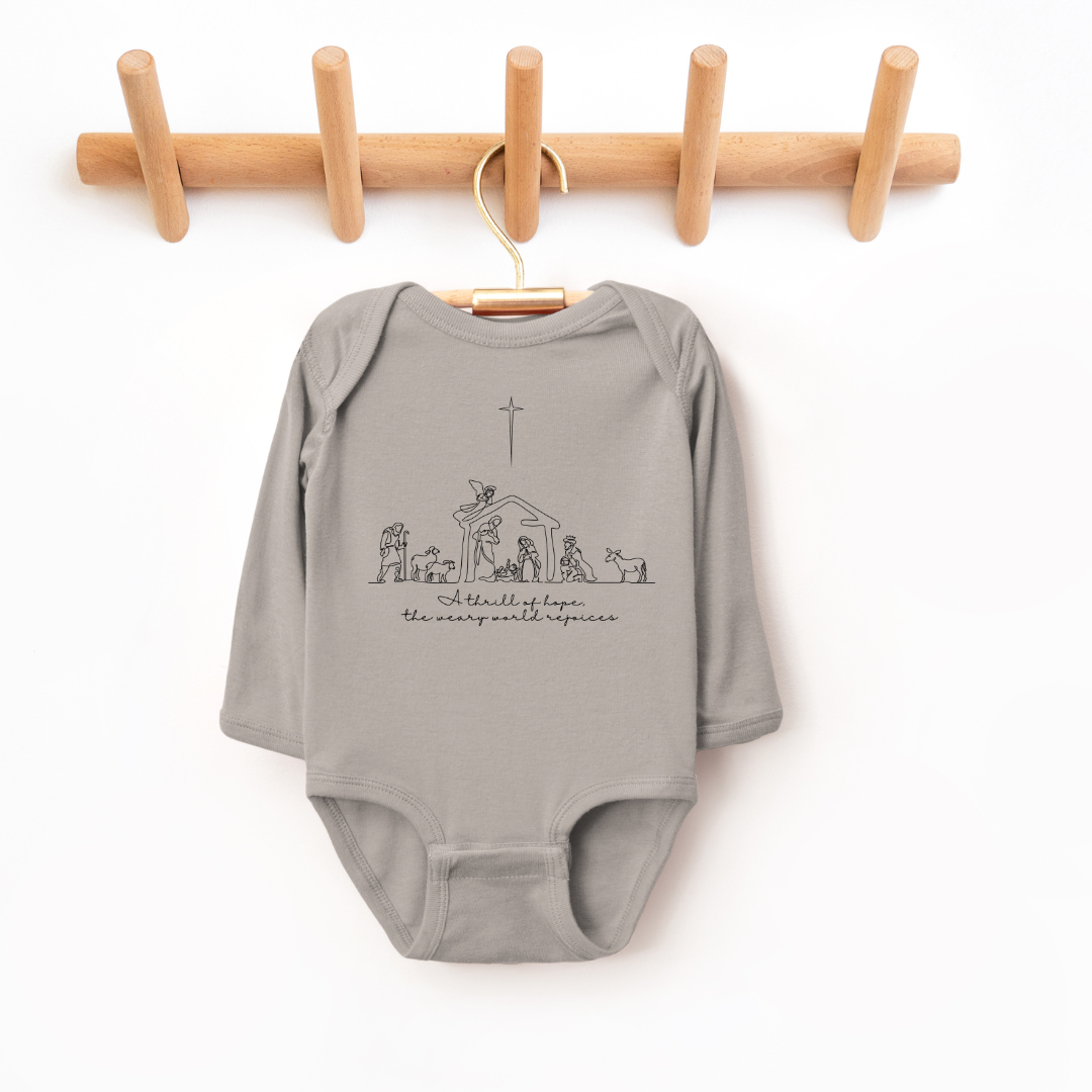 Celebrate the true meaning of Christmas with our "A Thrill of Hope" long sleeve bodysuit. This adorable bodysuit features a simple yet beautiful nativity scene design, paired with the words "A thrill of hope, the weary world rejoices." Crafted from soft, comfortable fabric, it’s perfect for keeping your little one cozy through the holiday season. The easy snap closures make changes quick and fuss-free, making it ideal for family gatherings, holiday photos, or a thoughtful gift. Available in various sizes, this bodysuit brings a message of peace and hope to your little one's wardrobe.