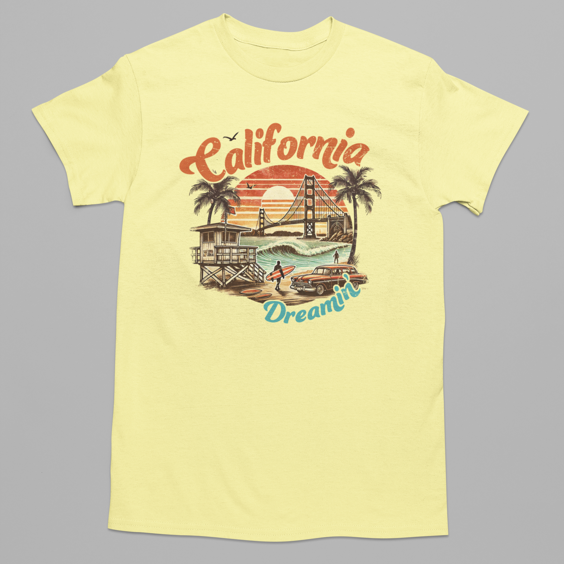 Capture the essence of California with the California Dreamin' Graphic Tee. Featuring the Golden Gate at sunset, rolling waves, surfboards, and beach vibes, this shirt embodies the laid-back spirit and endless dreams of the West Coast. Perfect for those who want to wear their California dream wherever they go.