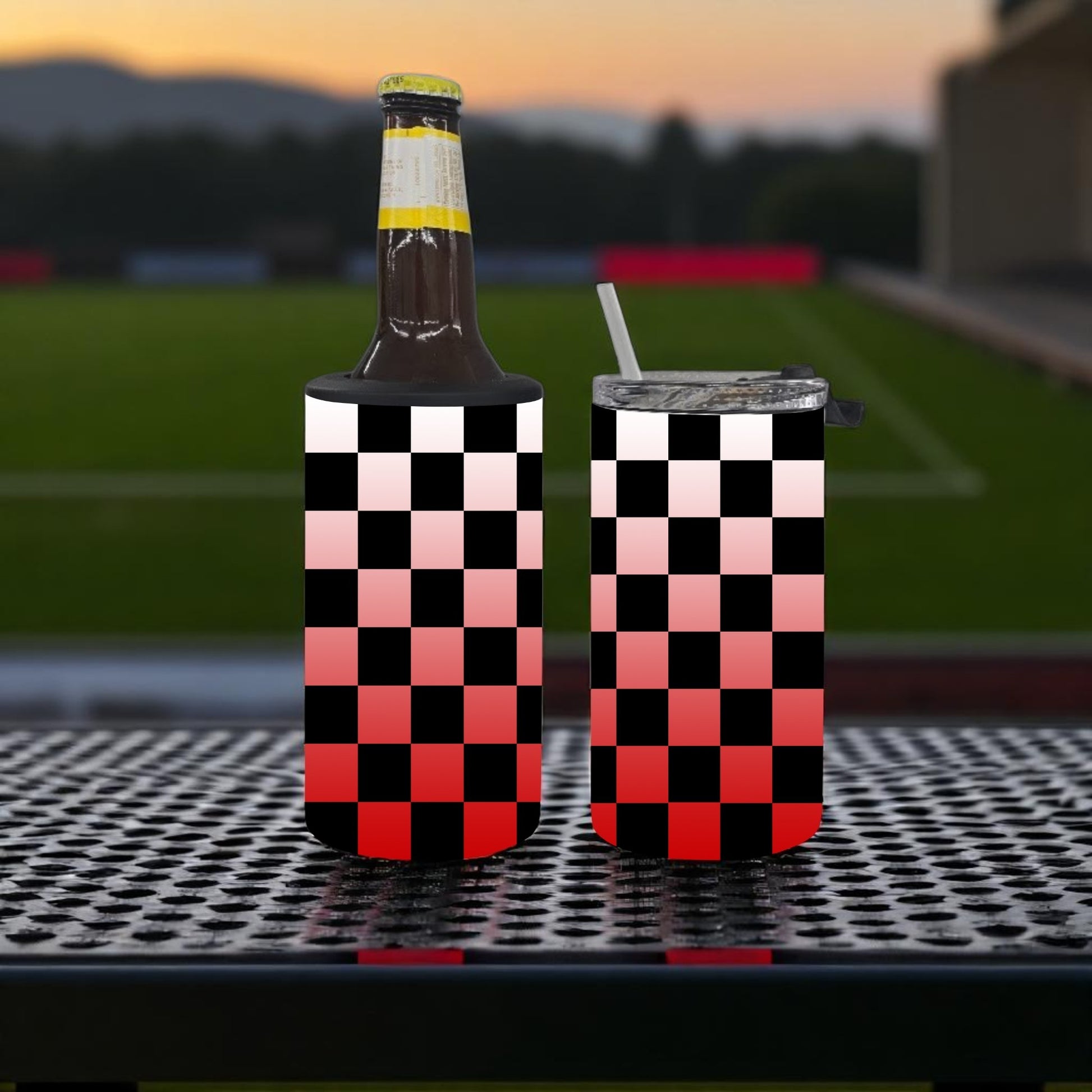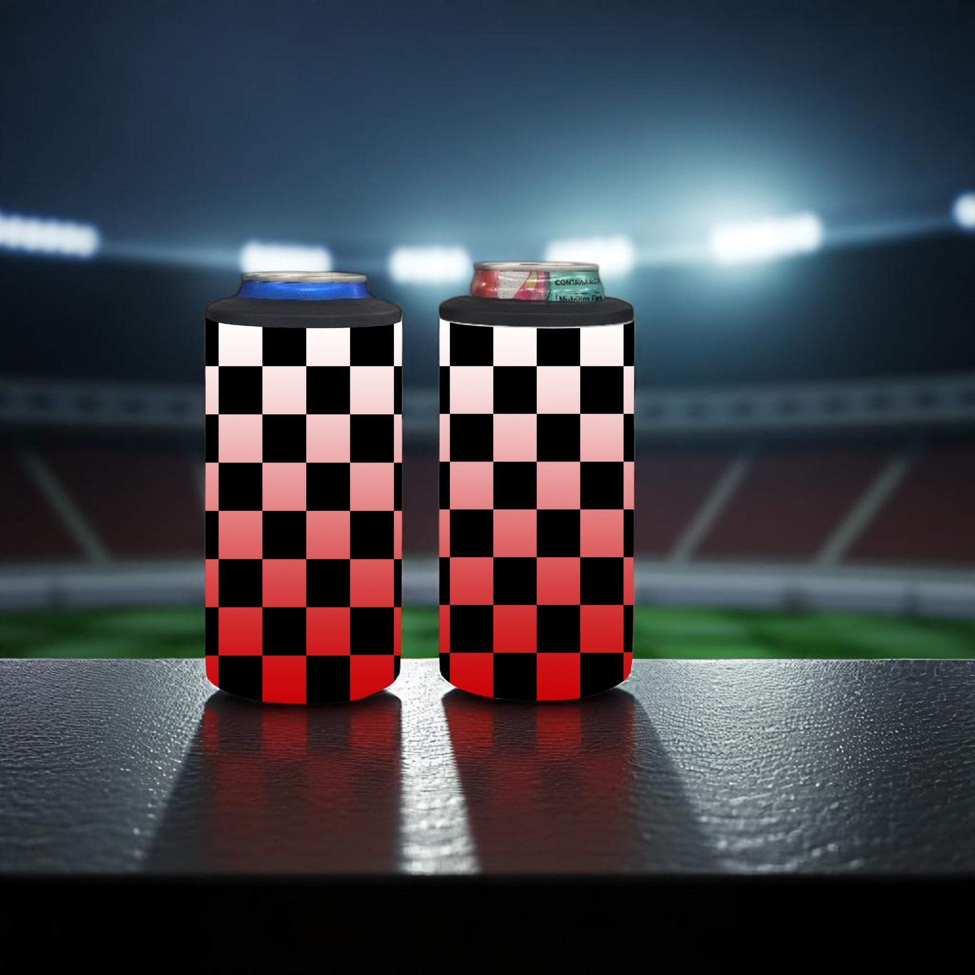 The Candy Apple Fade 4-in-1 Can Cooler Cup perfectly balances sweet and striking with a soft white that fades into juicy red, enhanced by a timeless checkerboard pattern.