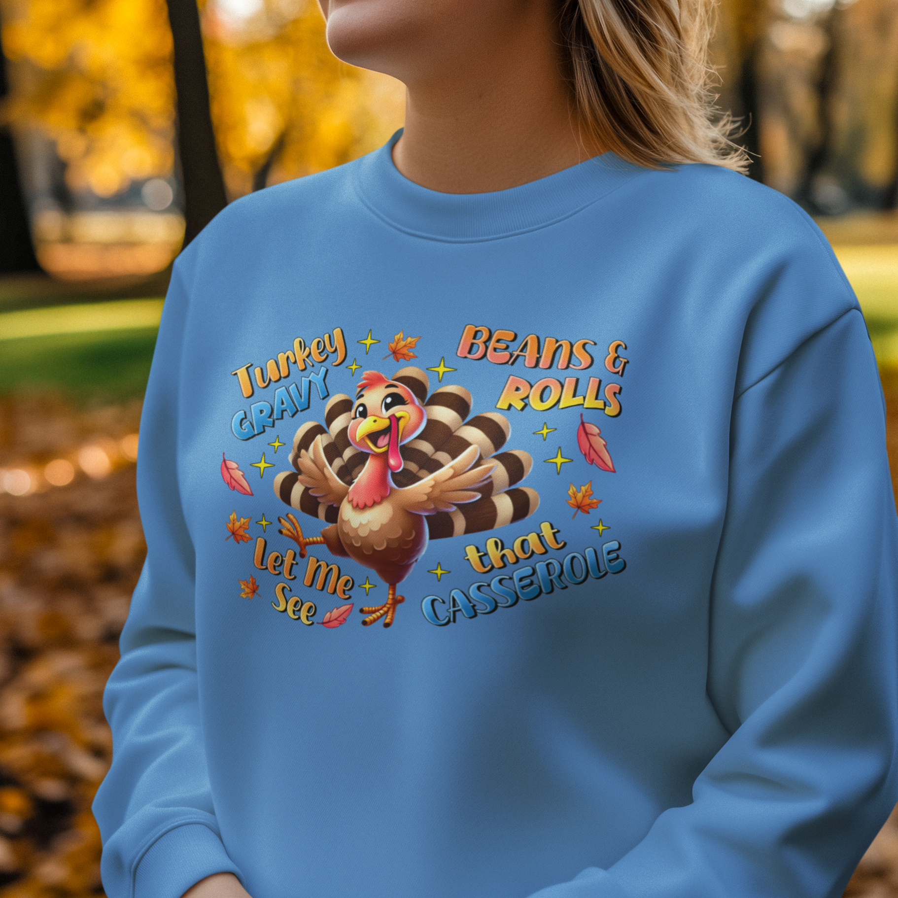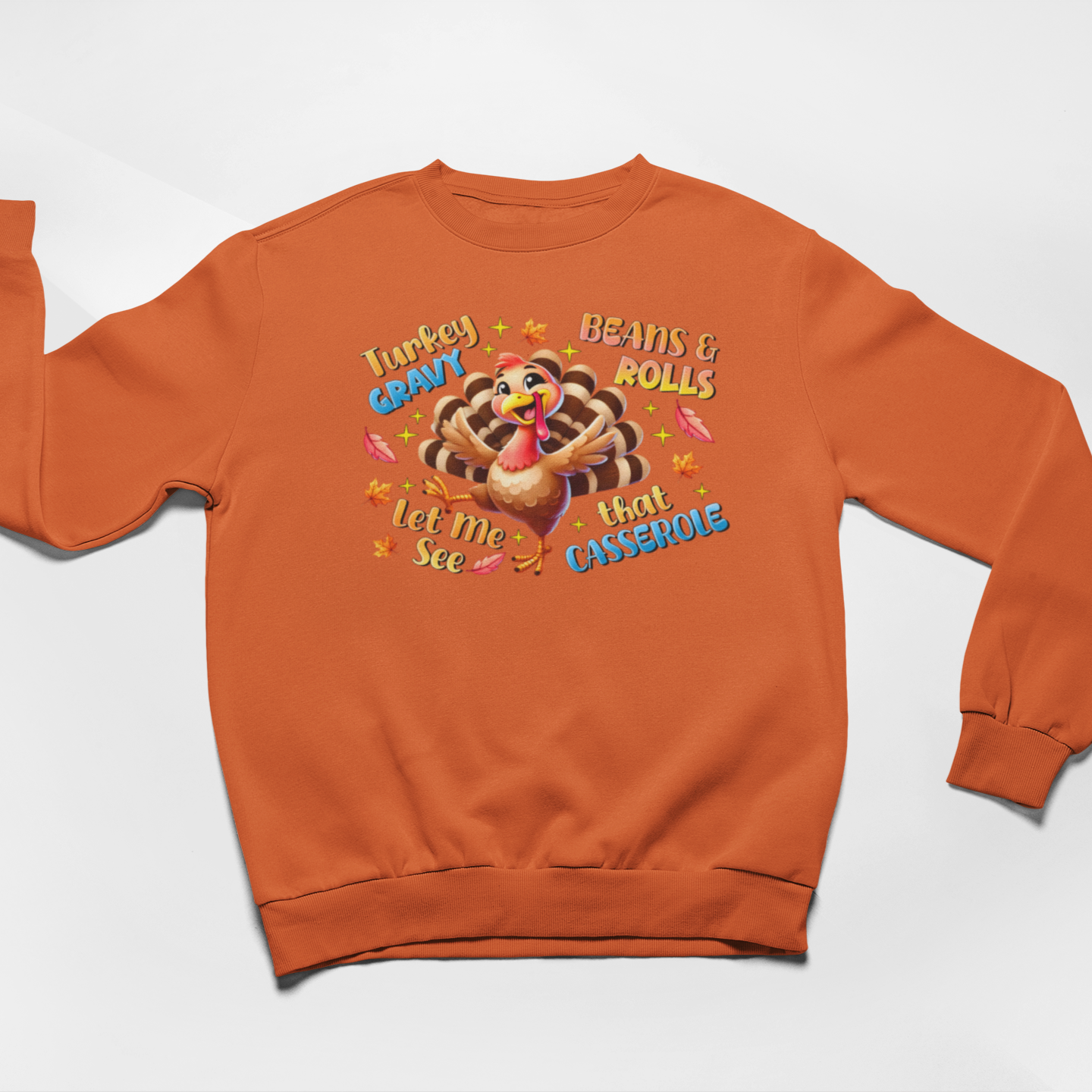Celebrate your love for Thanksgiving with the Casserole Countdown Graphic Sweatshirt. Featuring a joyful turkey surrounded by phrases like “Turkey, Gravy, Beans & Rolls, Let Me See That Casserole,” this design brings humor and holiday cheer to your outfit. Stay cozy while showcasing your festive foodie spirit at every gathering.
