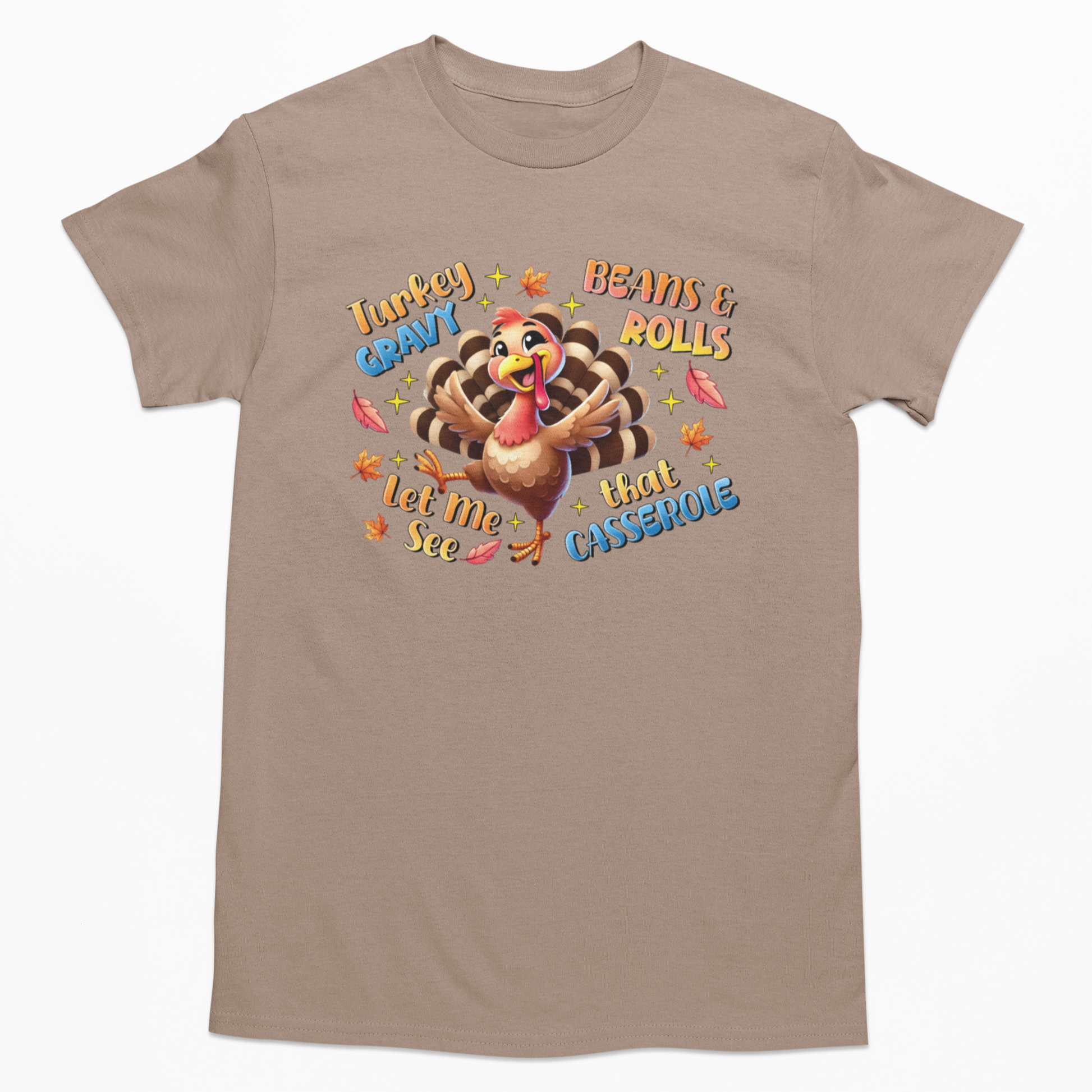 Get ready for Thanksgiving with the Casserole Countdown Graphic Tee. Featuring a cheerful turkey surrounded by the fun phrases “Turkey, Gravy, Beans & Rolls, Let Me See That Casserole,” this shirt celebrates all your favorite holiday dishes. It's a playful way to show your love for the feast and bring smiles to everyone around the table.