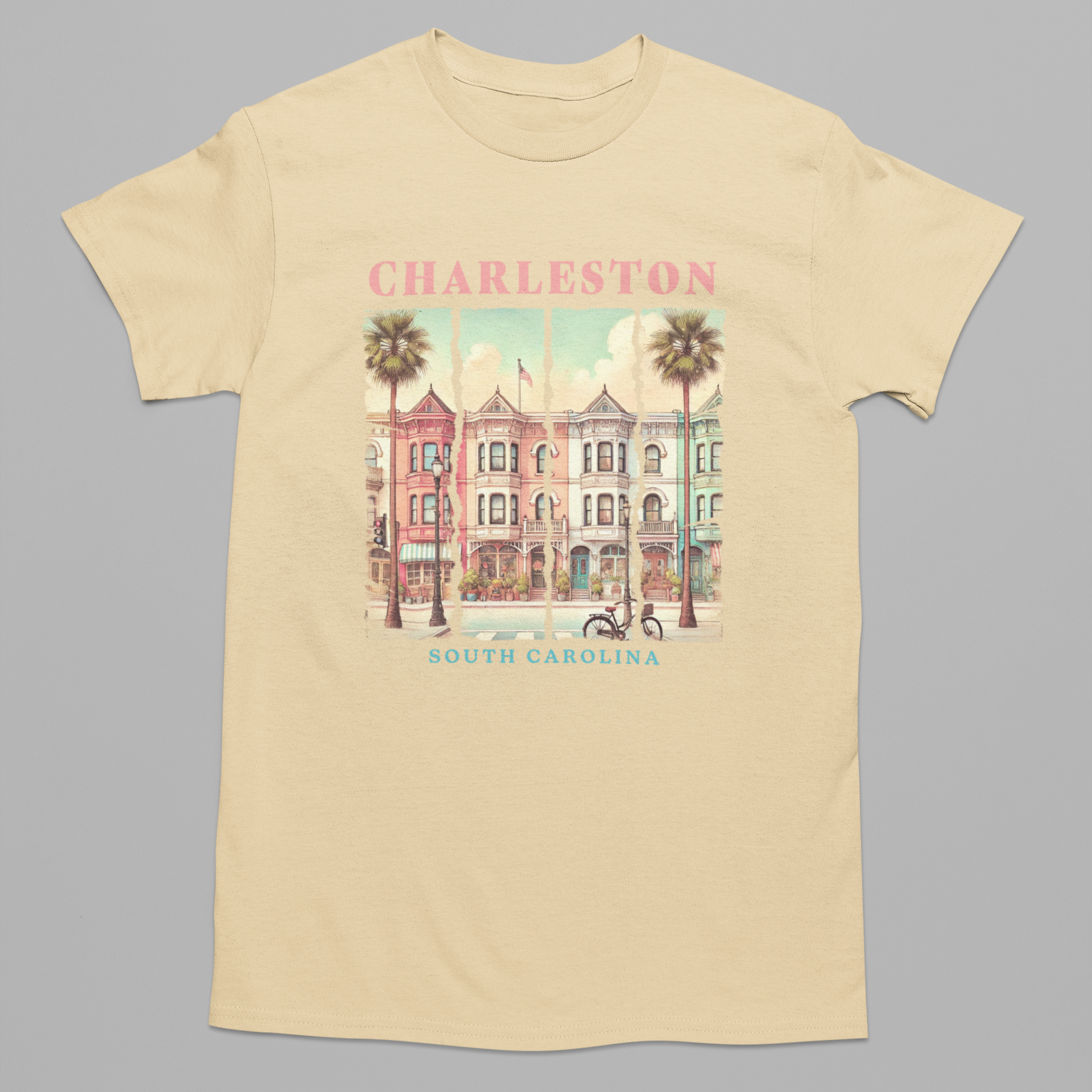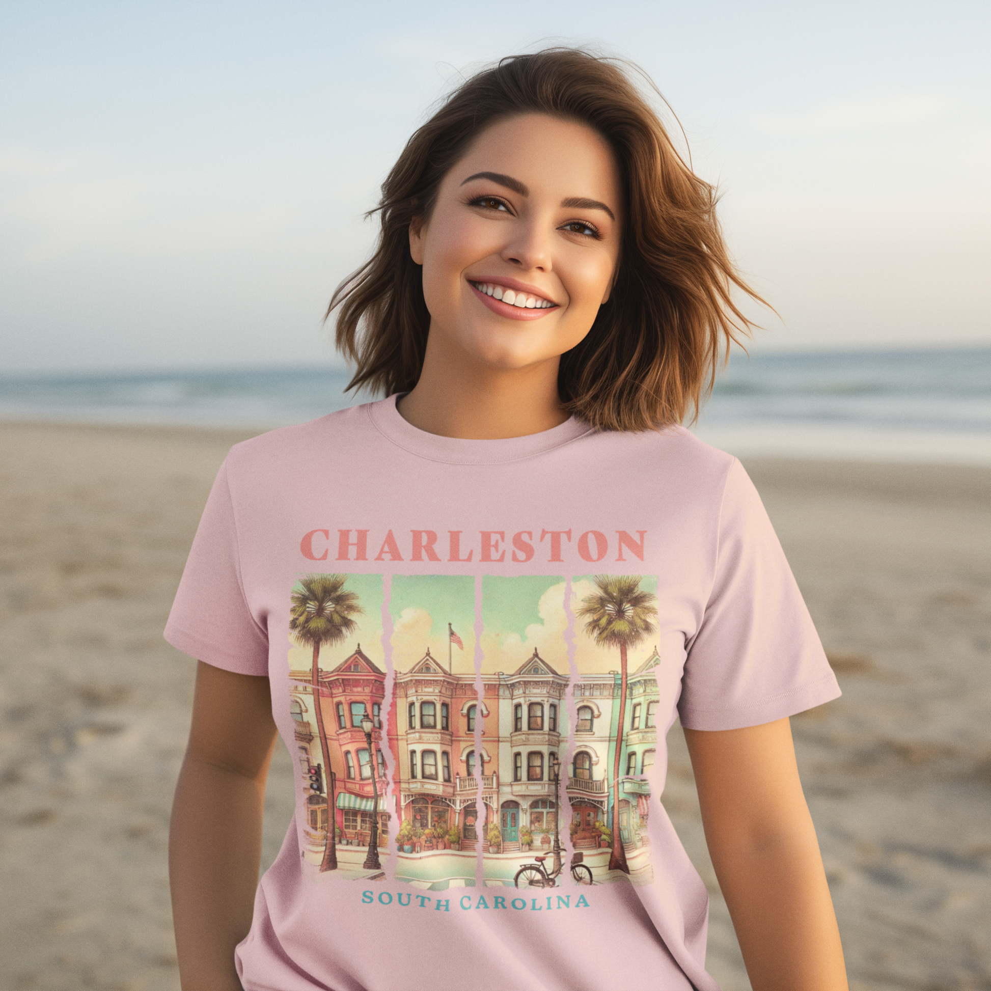 Celebrate Charleston’s charm with the Charleston Charm Graphic Tee. Featuring soft pastel hues of Rainbow Row and graceful palm trees, this shirt captures the city’s colorful and inviting spirit. Perfect for those who want to carry a piece of Charleston’s beauty and warmth wherever they go.