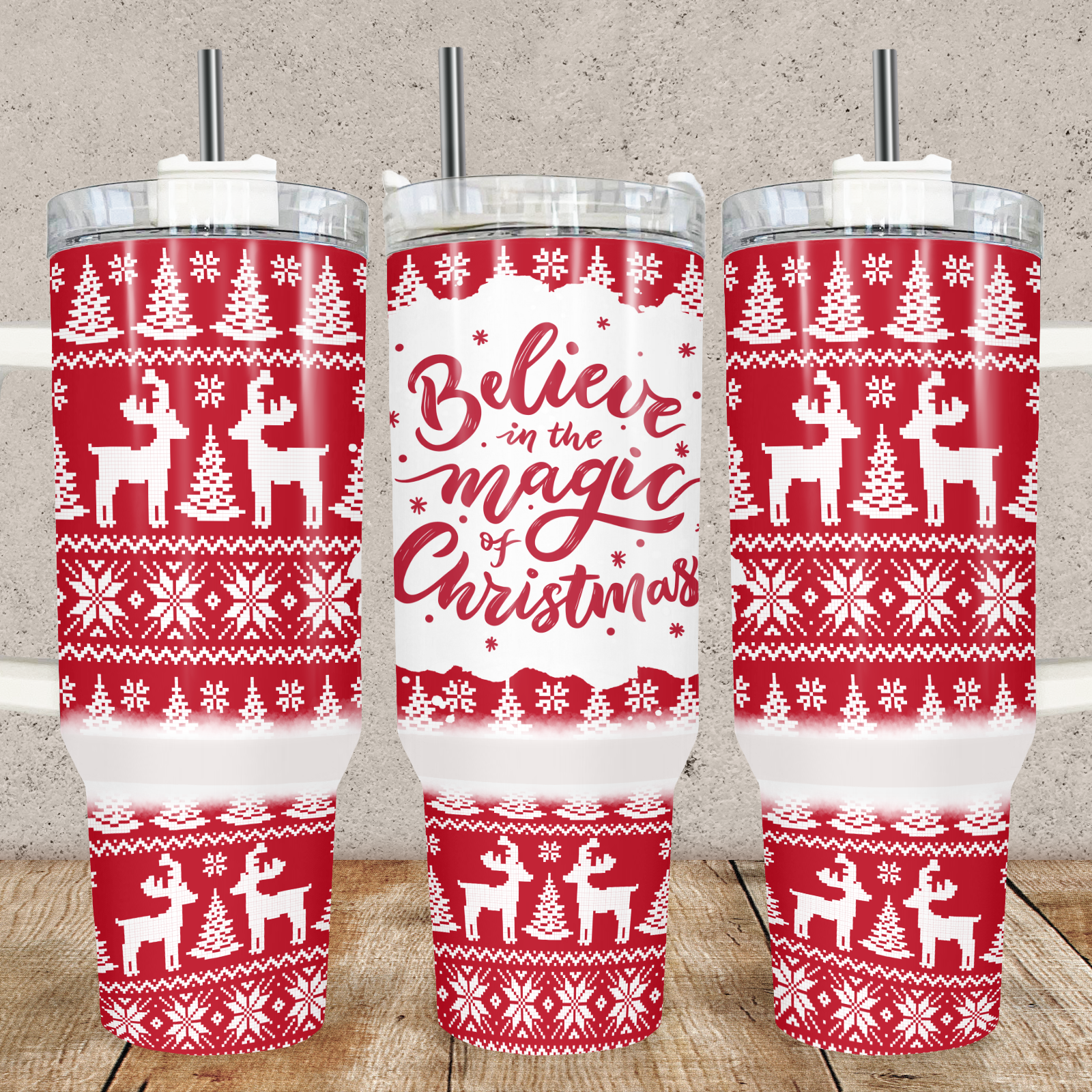 Get into the festive spirit with our “Believe in the Magic of Christmas” tumbler! Styled like a cozy Christmas sweater, this tumbler features charming reindeer, Christmas trees, and snowflakes in a classic red and white pattern. Made from high-quality stainless steel, it keeps your drinks hot or cold for hours, perfect for enjoying your favorite holiday beverages. With its nostalgic design and joyful message, this tumbler is a wonderful gift or a merry addition to your own collection. Bring a little extra warmth and magic to your sips this Christmas season!