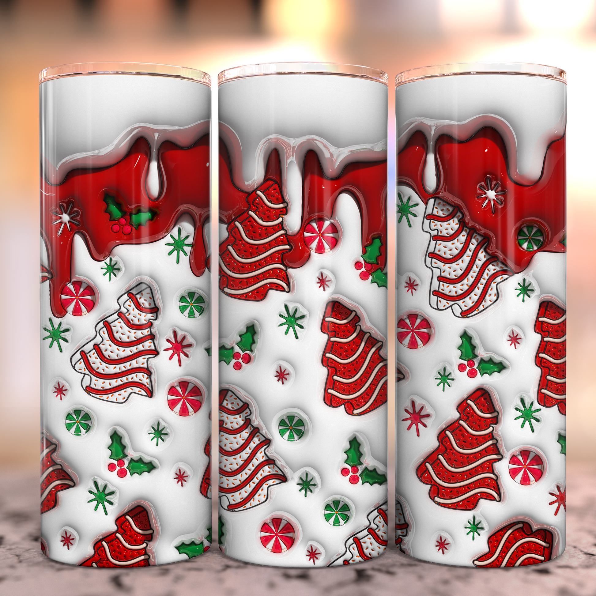 Deck the halls (and your drinkware) with this festive 20 or 30-ounce stainless steel tumbler! Featuring delightful Christmas trees, peppermint candies, holly, and drippy red icing, this tumbler screams holiday cheer. The vibrant red and green accents pop against a snowy white background, making it the perfect accessory for all your holiday activities—from gift wrapping marathons to sipping cocoa by the fire.
