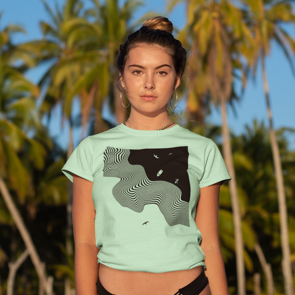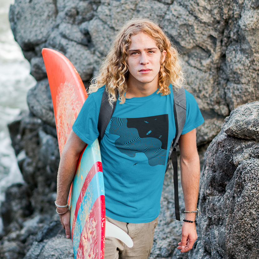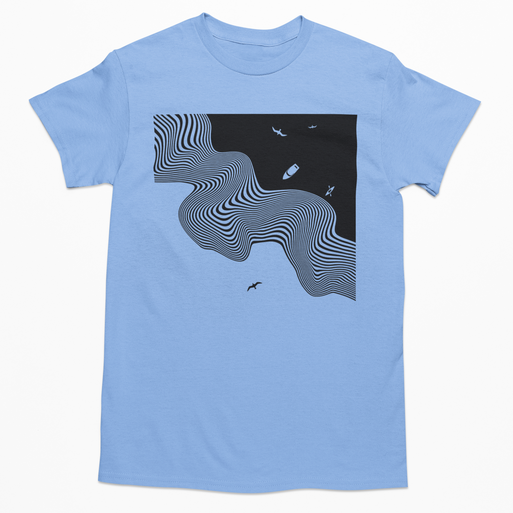 The Coastline Graphic Tee features wavy contour lines forming a surreal aerial view with boats and birds, embodying calm, balance, and subtle boldness. This design offers a fresh perspective for those who appreciate serene yet striking art, making it a standout addition to any wardrobe.