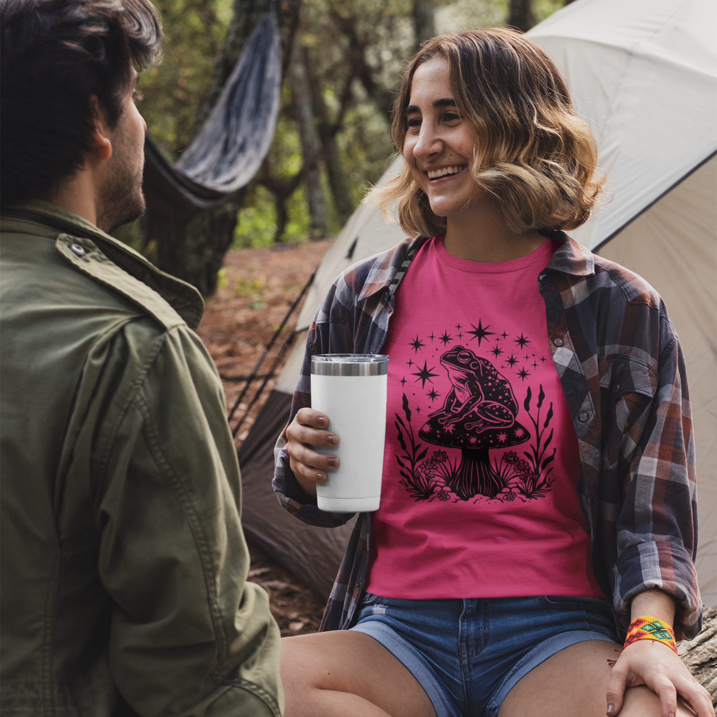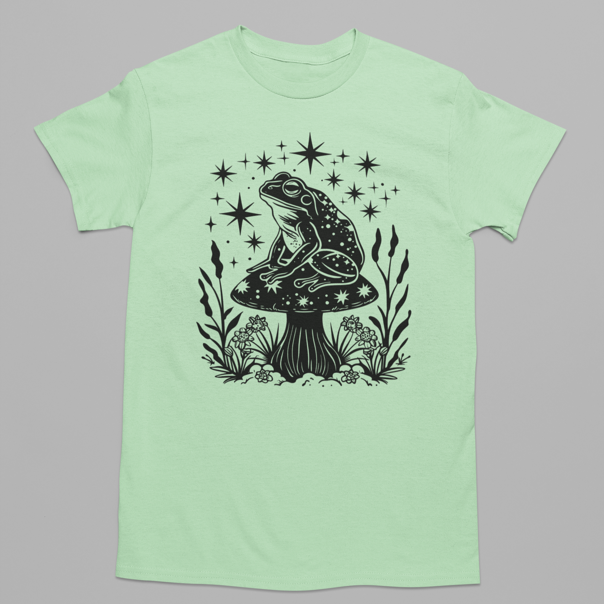 Immerse yourself in celestial cottagecore vibes with the Cosmic Toadstool Graphic Tee. Featuring starry skies, enchanting mushrooms, and a relaxed toad, this shirt brings a magical, dreamy energy to your everyday look. Perfect for those who love nature’s whimsy with a cosmic twist.