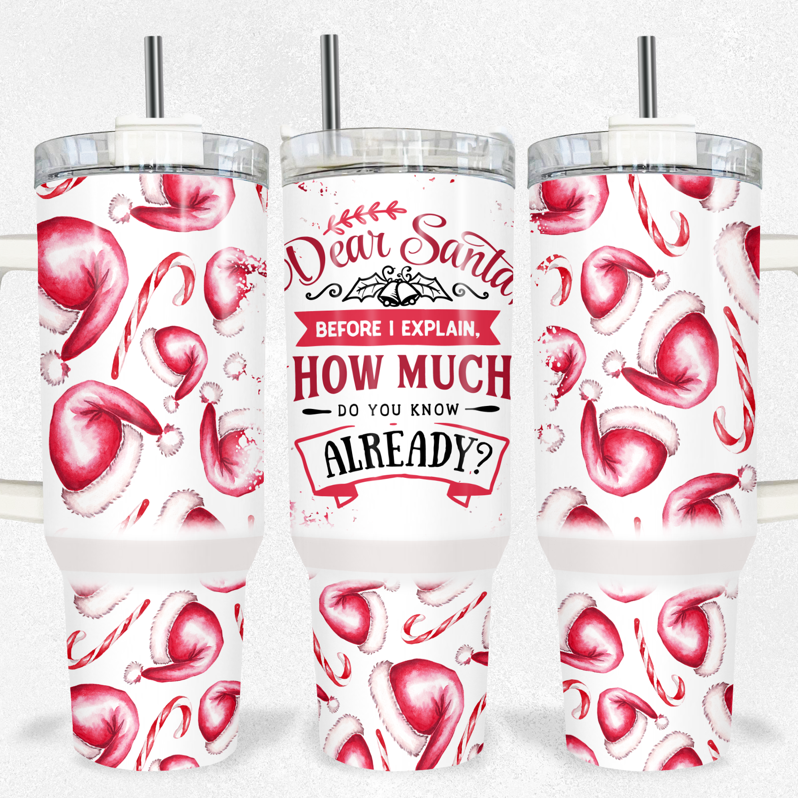 Get festive with our “Dear Santa, Before I Explain, How Much Do You Know Already?” tumbler! Perfect for Christmas lovers with a playful side, this tumbler combines holiday spirit with a dash of humor. Featuring a whimsical design of Santa hats and candy canes, it’s the ultimate Christmas accessory for your morning coffee, hot cocoa, or eggnog. The high-quality stainless steel construction keeps drinks hot or cold for hours, so you can sip in style all season long. Whether it's for yourself or as a fun Christmas gift, this tumbler is sure to spread holiday cheer!