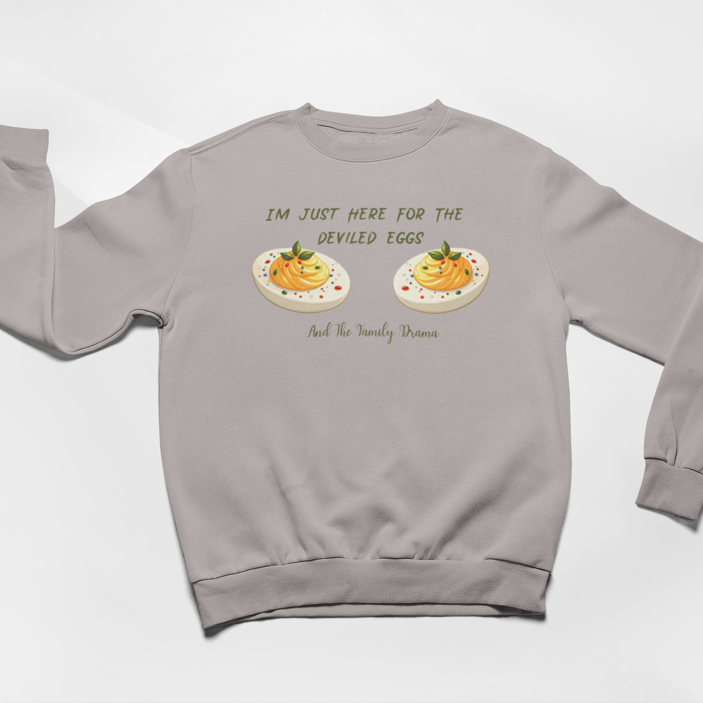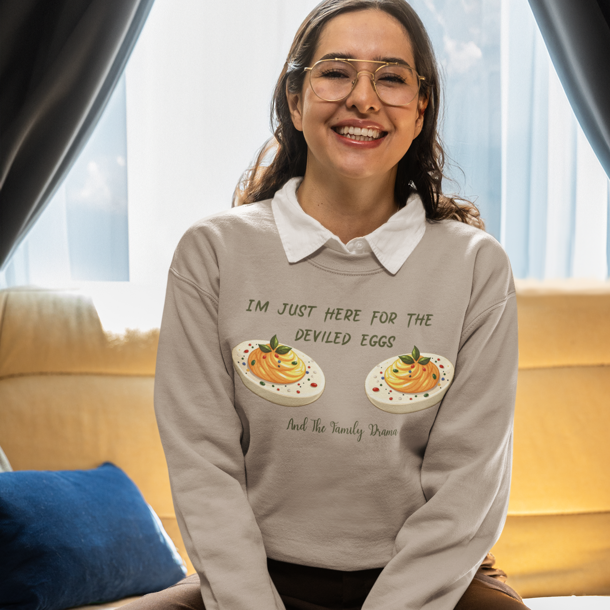 Bring humor to your Thanksgiving gatherings with this Deviled Eggs & Drama Graphic Sweatshirt. Featuring the witty phrase “I’m just here for the deviled eggs and the family drama” alongside charming illustrations of deviled eggs, this sweatshirt is perfect for adults who appreciate the true highlights of holiday dinner. Comfortable and lighthearted, it’s a fun way to showcase your festive spirit and sense of humor all season long.