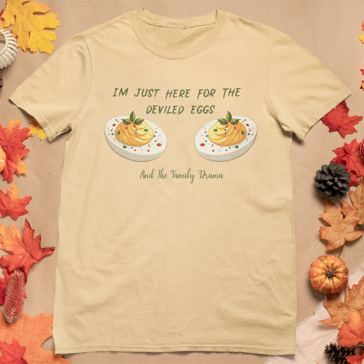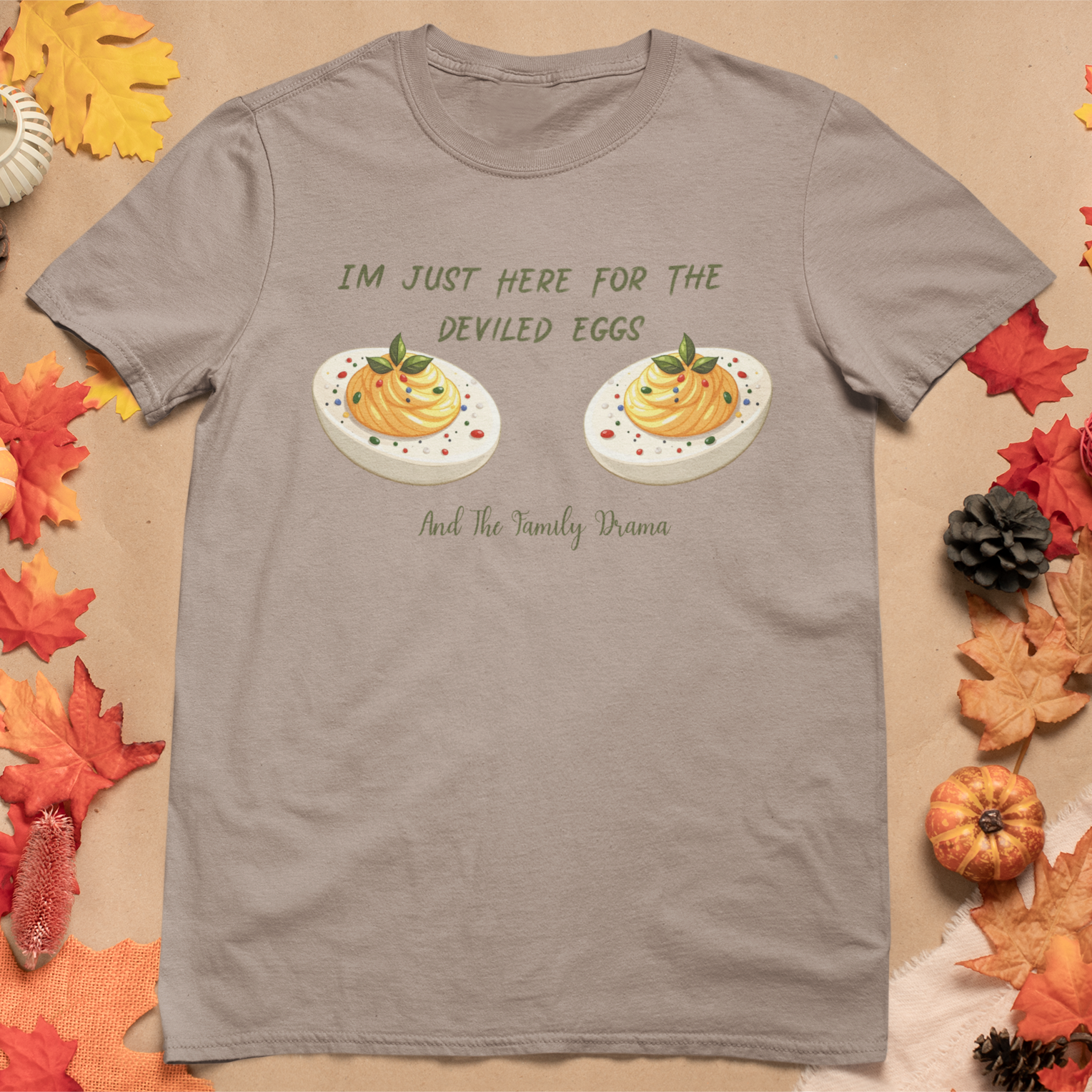 Celebrate Thanksgiving with a twist in this Deviled Eggs & Drama Graphic Tee. Featuring the playful phrase “I’m just here for the deviled eggs and the family drama” alongside charming illustrations of deviled eggs, this shirt perfectly captures the humor of holiday gatherings. It’s an ideal choice for adults who appreciate the fun side of family dinners and want to share a laugh while staying comfortable and stylish. Make your holiday outfit memorable with this witty and casual tee.