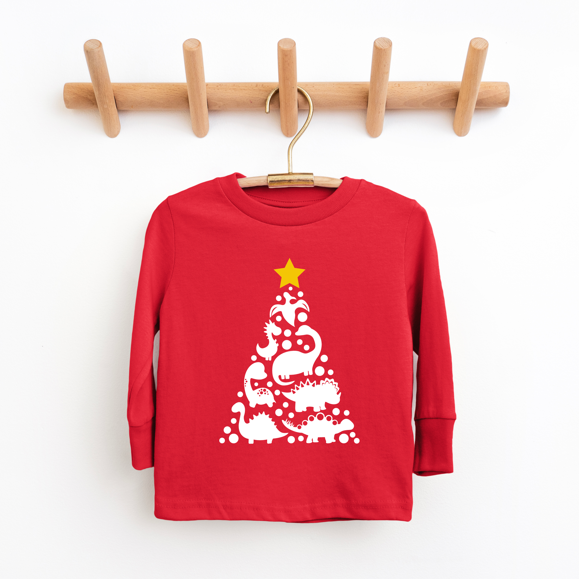 Deck the halls with dinos! This long-sleeve tee combines the magic of Christmas with the fun of dinosaurs, featuring a unique Christmas tree design made entirely of dino silhouettes topped with a bright yellow star. Perfect for little ones who love prehistoric creatures and holiday cheer, this shirt is soft, comfortable, and festive. It’s great for wearing to holiday parties, school events, or casual family gatherings. Let your kiddo roar into the holiday season with this playful, dino-inspired Christmas tee!