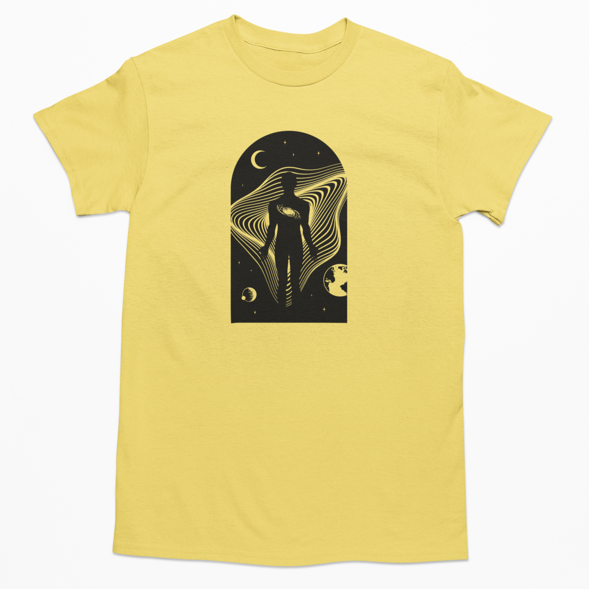 The Emation Graphic Tee showcases a celestial silhouette wrapped in flowing stardust, blending mystery, empowerment, and cosmic energy. This captivating design invites you to embrace your inner strength and cosmic connection, making it a powerful statement piece for those who shine beyond the ordinary.