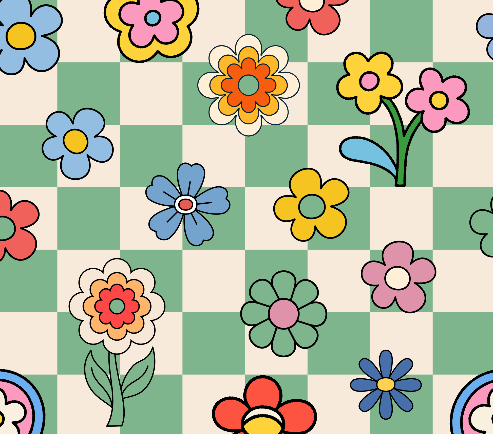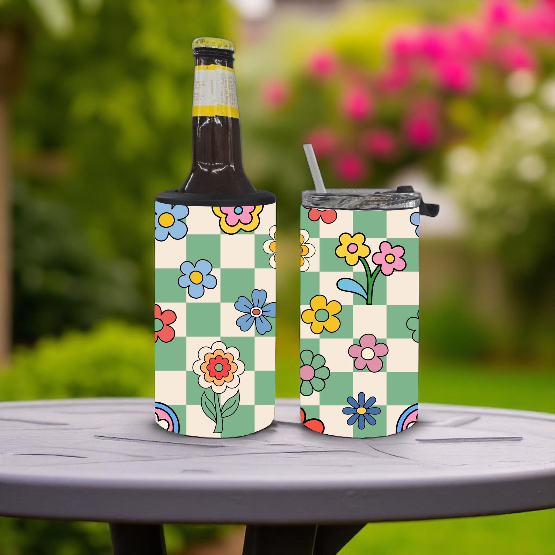 Step into a world where vintage charm meets playful fun with the Flower Patch Checkers 4-in-1 Can Cooler Cup. Retro florals dance over soft green checkers, creating a fresh and cheerful look.