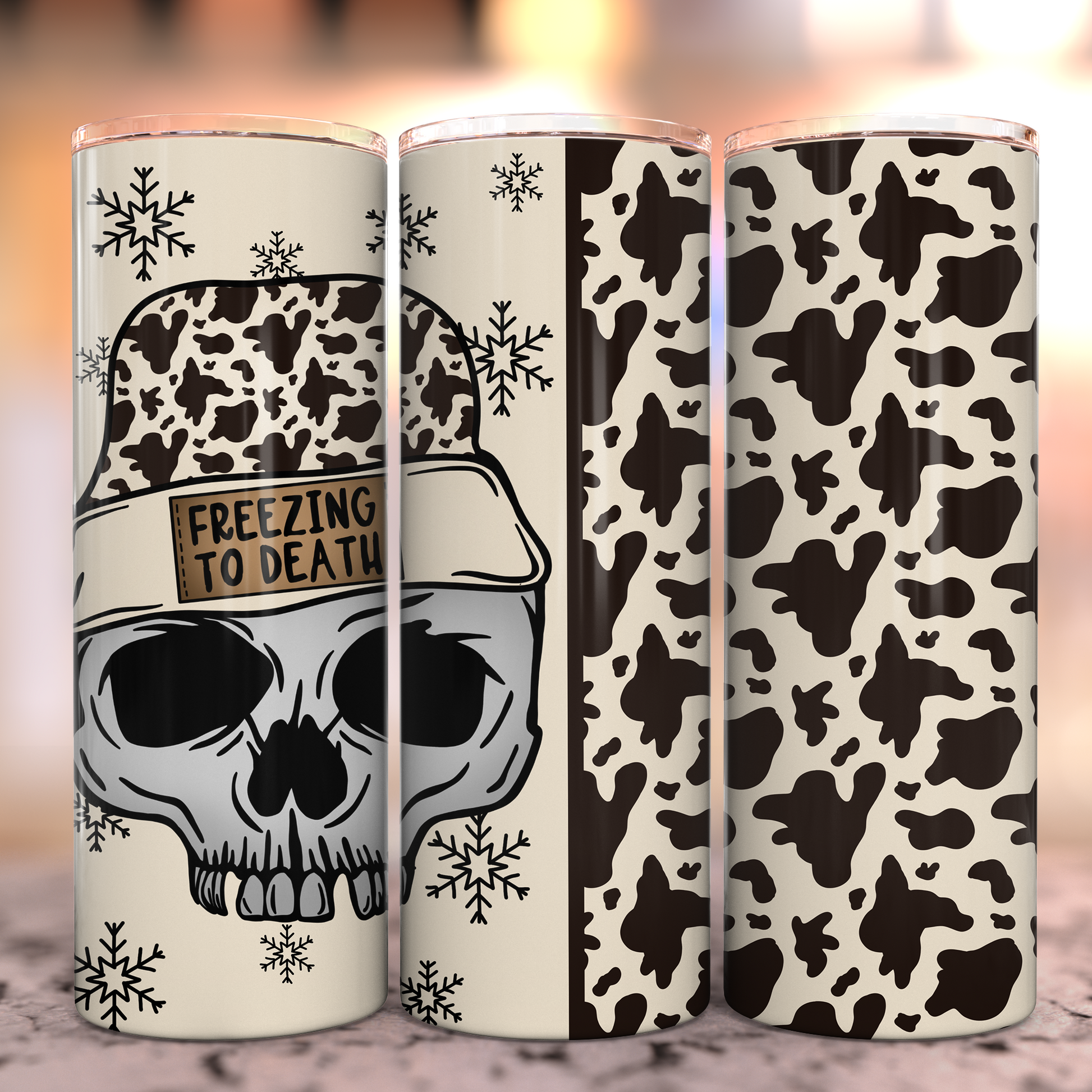 This 20 or 30-ounce stainless steel tumbler is here to keep you warm while embracing your inner frosty rebel! Featuring a bold design of a skull wearing a cow-print beanie with the cheeky phrase "Freezing to Death," it’s the perfect companion for chilly days. With a rugged yet stylish cow-print pattern and scattered snowflakes, this tumbler is great for those who love a little attitude with their winter accessories.