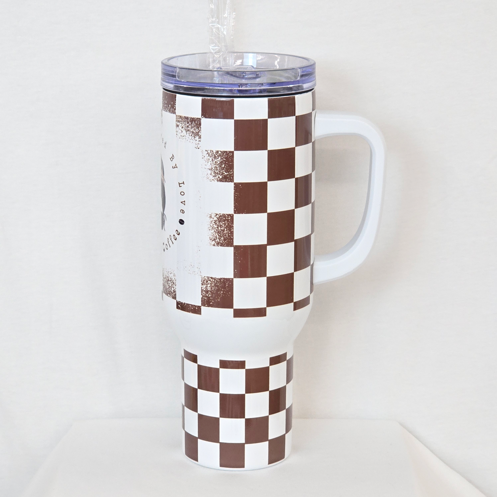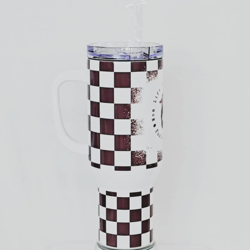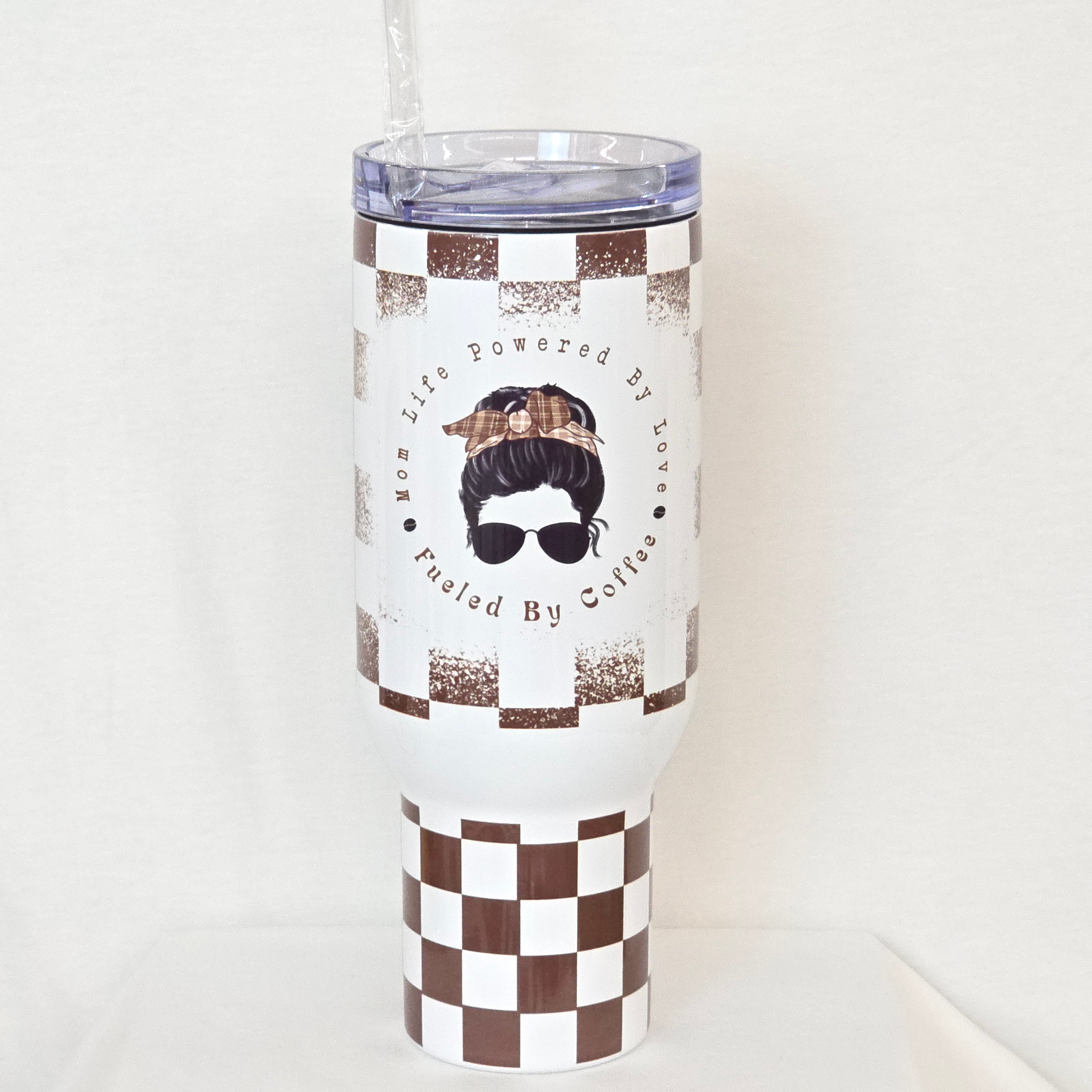 Keep up with mom life in style! Our Fueled by Coffee 40 oz tumbler is made for the multitasking mama who runs on caffeine and chaos. Featuring a bold brown checkered pattern, a sturdy handle, and a fun graphic that reads “Mom Life Powered by Love • Fueled by Coffee,” this travel cup is as strong as your espresso.
