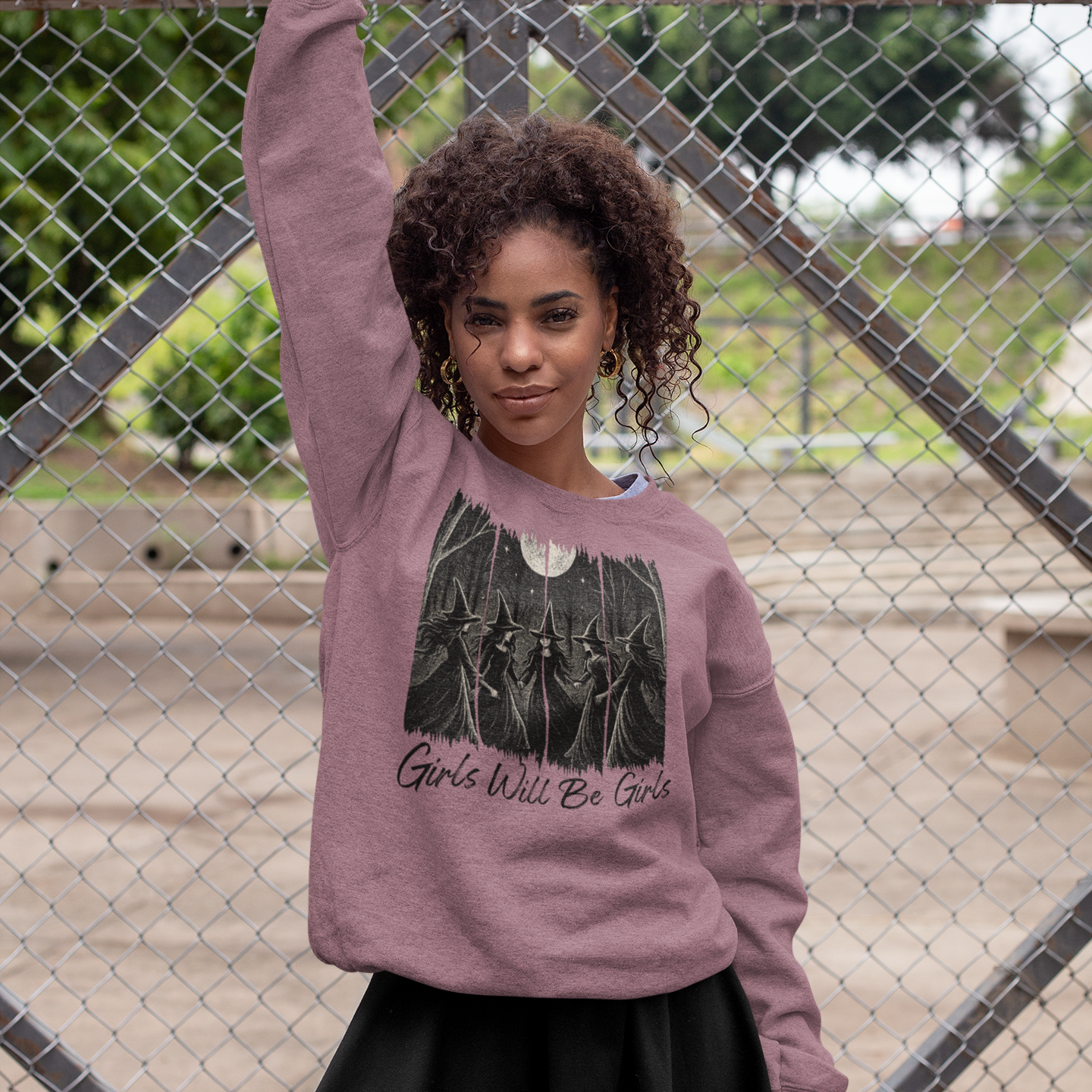 Embrace the spirit of spooky sisterhood with the Girls Will Be Girls Graphic Sweatshirt. Featuring a moody night scene with iconic witch hats and brooms, this sweatshirt combines comfort and style to make a bold statement. Perfect for those who love to celebrate their unique bond with a touch of eerie charm. Stay cozy while showcasing your fearless, fun-loving side.