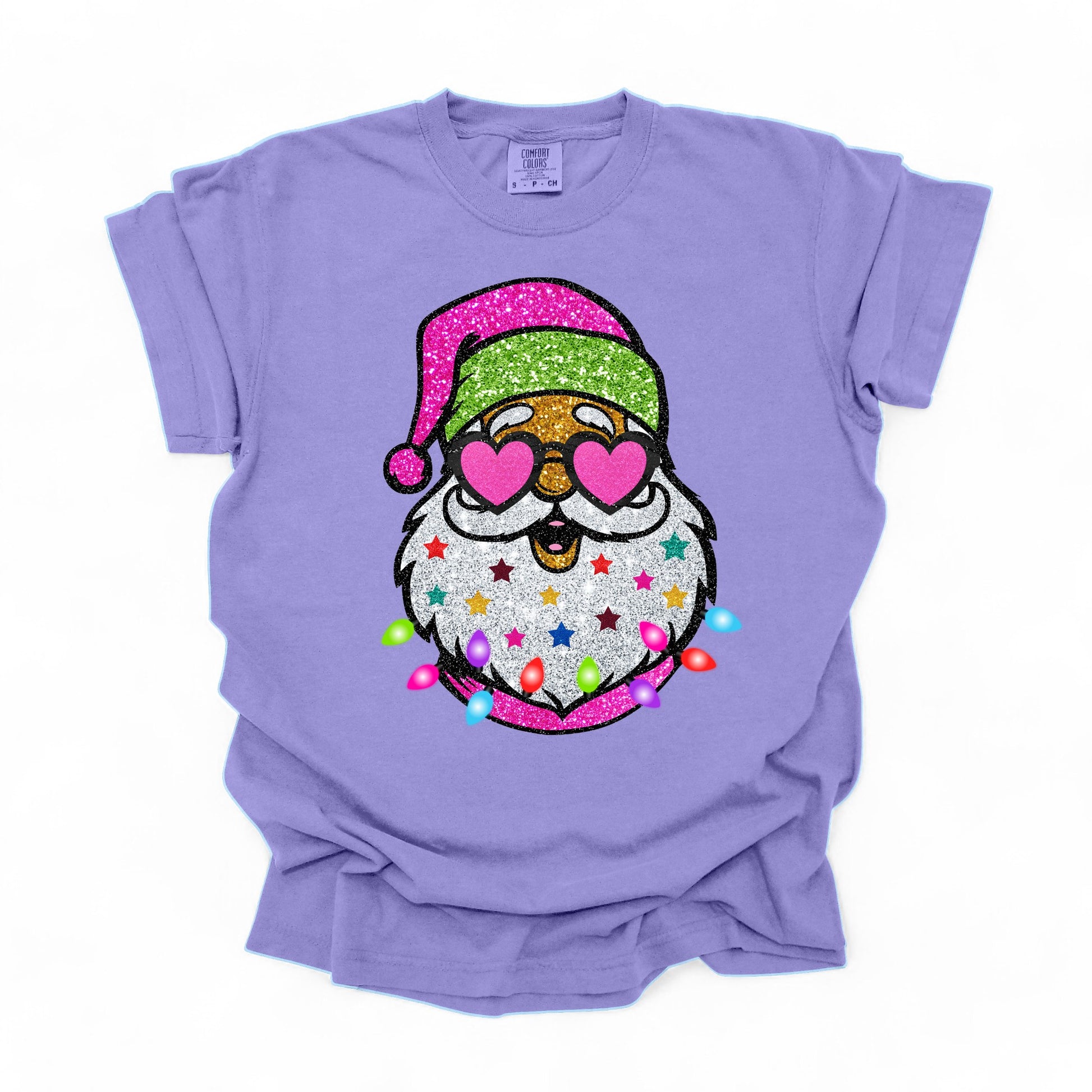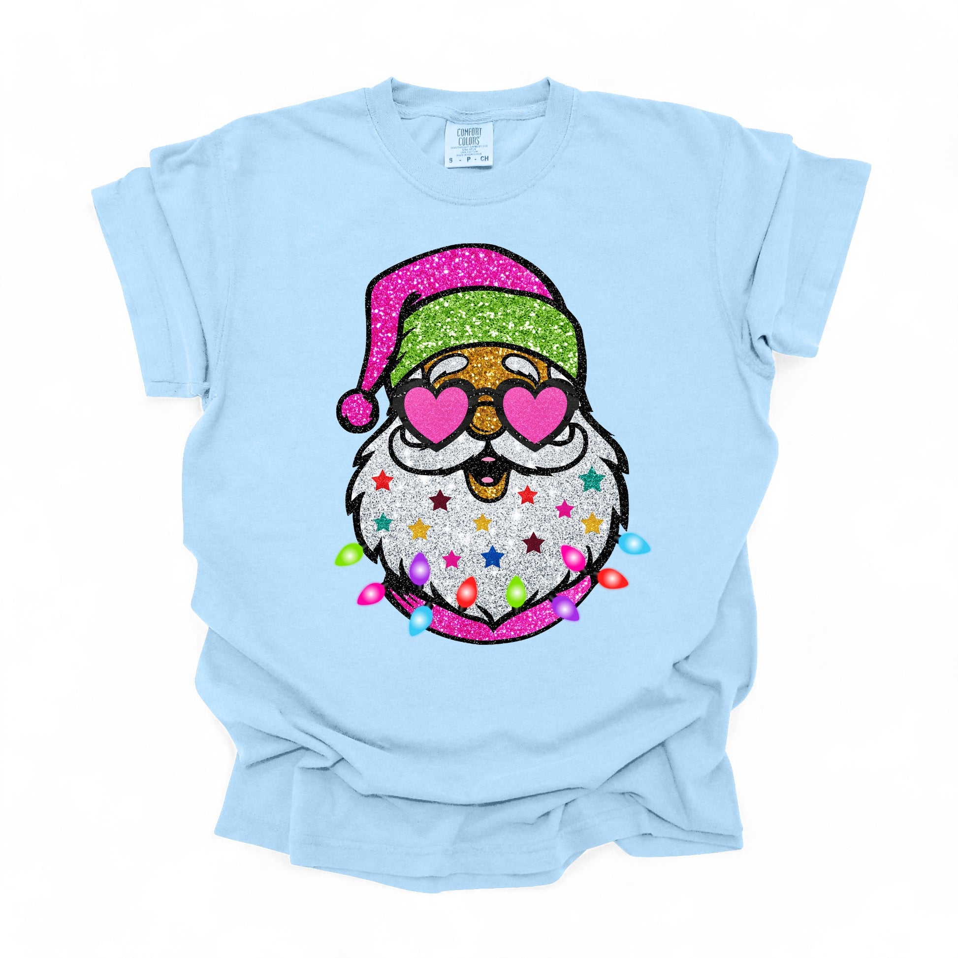 Add a sprinkle of sparkle to your holiday wardrobe with our Glitter Santa Graphic Tee! This Christmas graphic tee is all about festive fun, featuring a jolly Santa with heart-shaped sunglasses, a glittery beard, and colorful holiday lights. Perfect for anyone who loves to stand out during the holiday season, this tee combines comfort and style in one festive package. Ideal for holiday gatherings, Christmas shopping, or cozy nights in, it’s your new go-to for spreading Christmas cheer. Grab yours and let your holiday spirit shine!