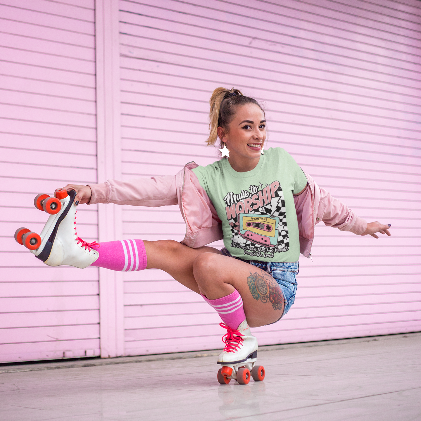 Get ready to bring some throwback vibes with our Graphic Tee! This pastel tee is the perfect mix of 80s worship and bold faith, topped off with a touch of checkered style. Whether you're hitting play or hitting the streets, this tee has got you covered. Praise on in style!
