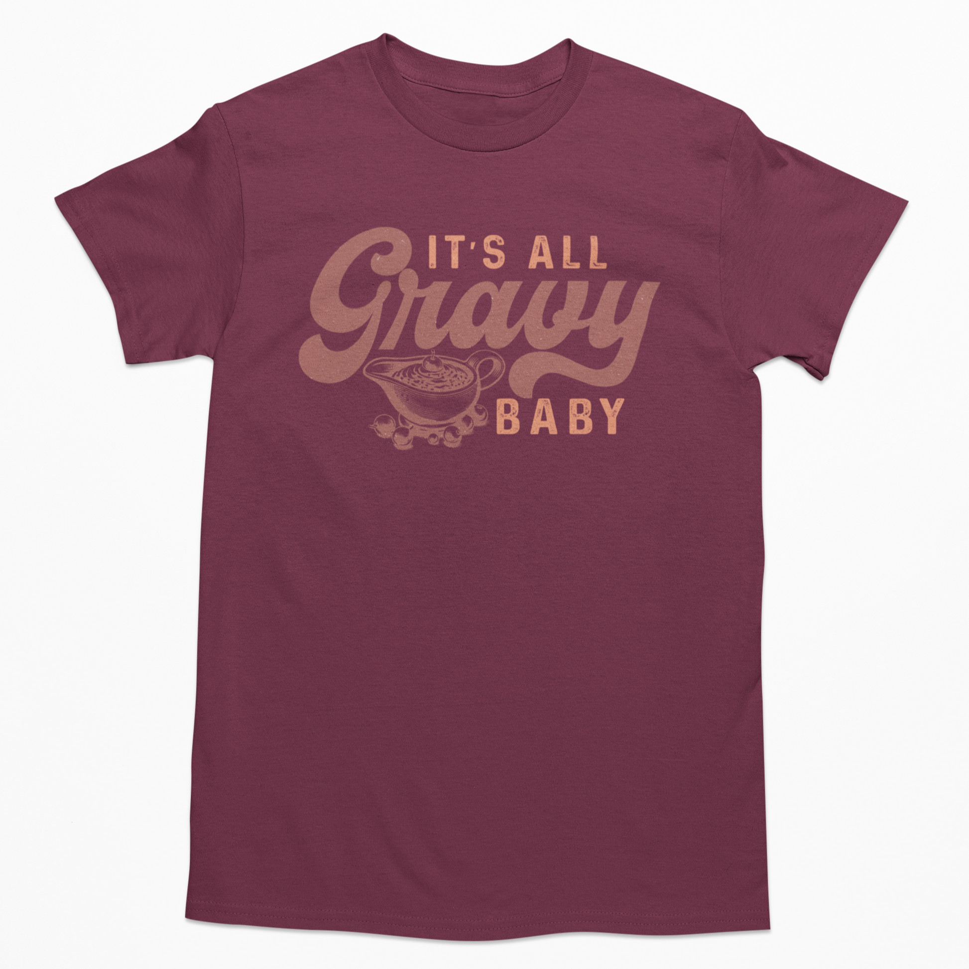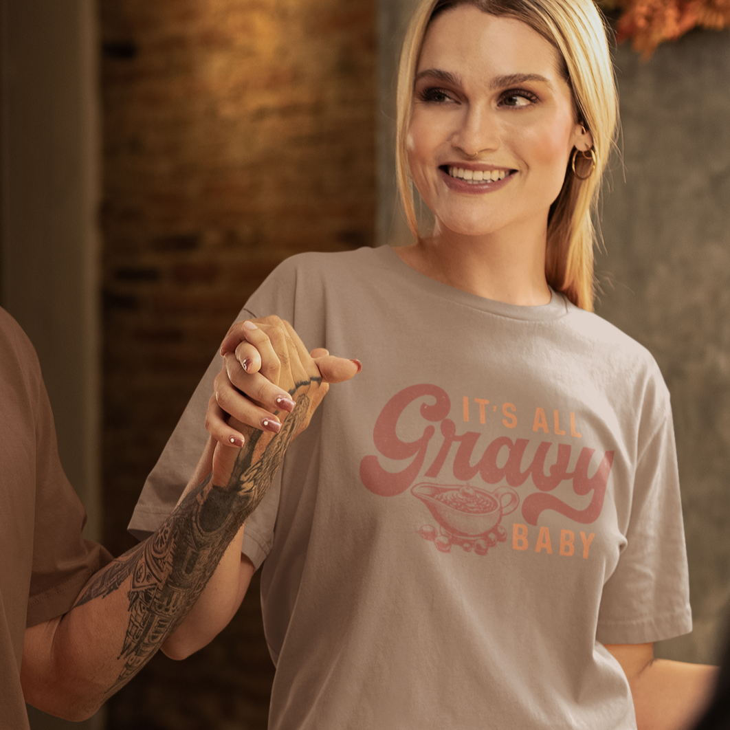 Embrace comfort food vibes with the Gravy Baby Graphic Tee. Featuring the catchy phrase “It’s All Gravy, Baby” in a cozy retro-style script alongside a classic gravy boat graphic, this shirt celebrates the simple joys of your favorite holiday dishes. Perfect for comfort-food lovers who want to add a touch of warmth and personality to their casual wardrobe, this tee blends style and fun for any relaxed occasion.