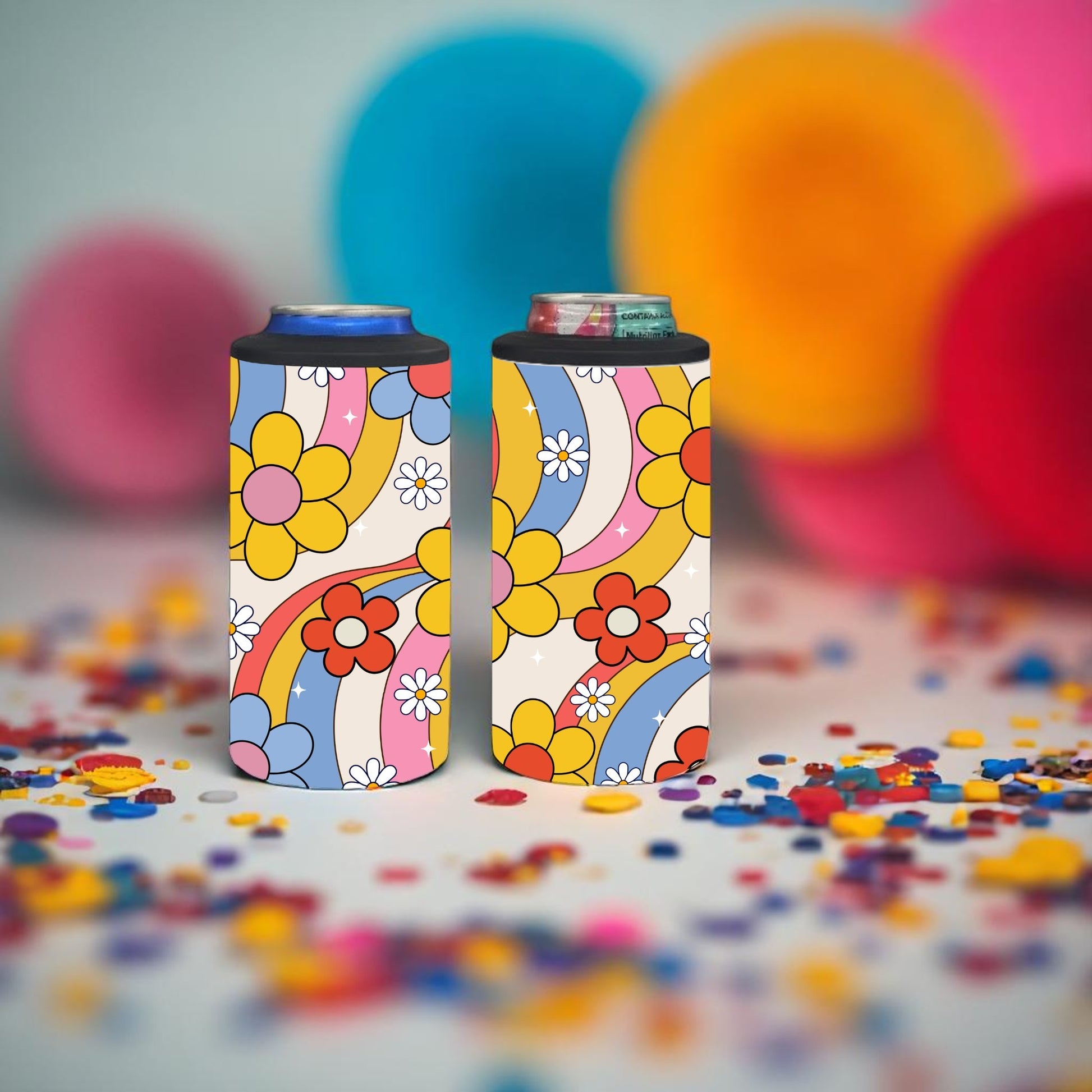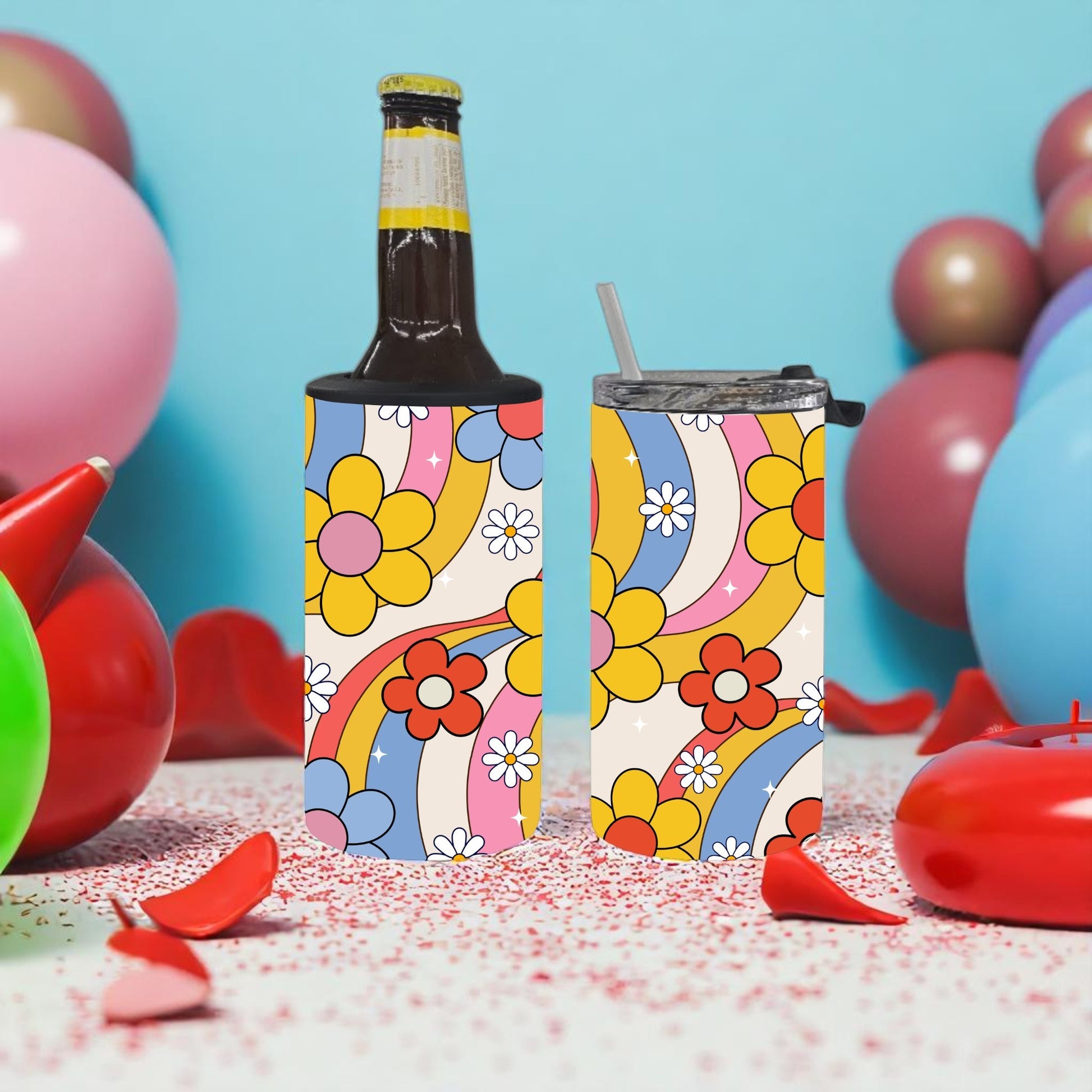 Add a splash of flower power and rainbow waves to your day with the Groovy Blooms 4-in-1 Can Cooler Cup! This vibrant cooler keeps your drinks perfectly chilled while bringing colorful, playful vibes wherever you go.