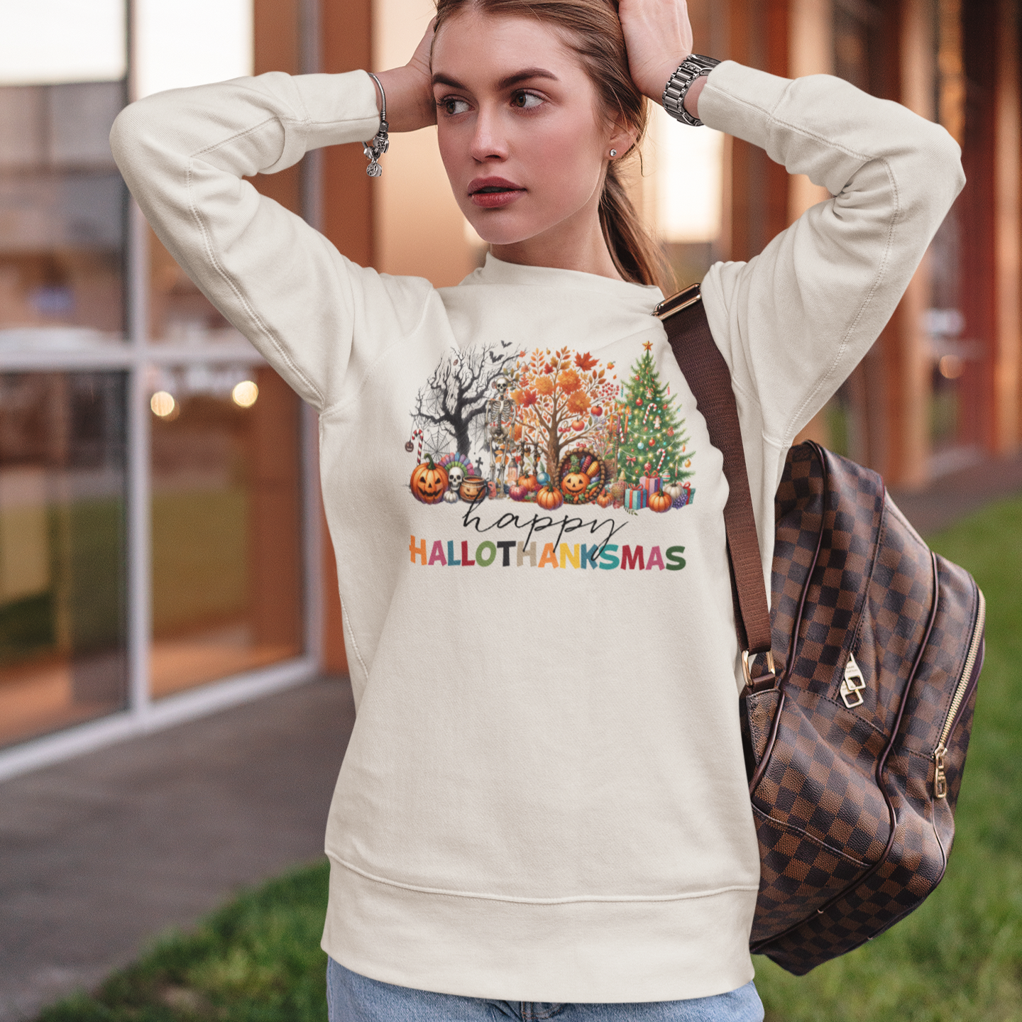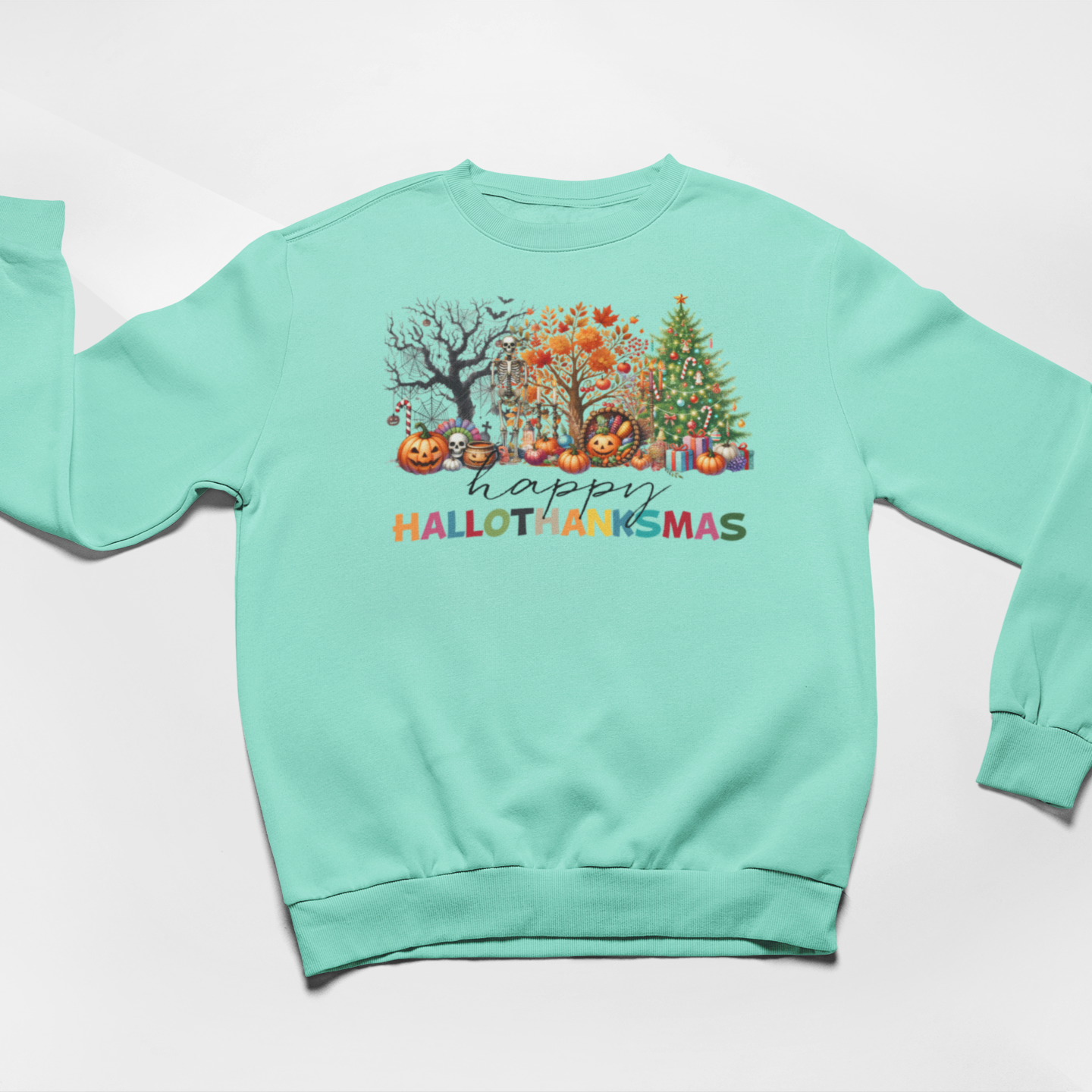Celebrate every holiday at once with the HalloThanksMas Graphic Sweatshirt. This unique design blends Halloween, Thanksgiving, and Christmas into one festive mash-up, perfect for those who want to embrace the full holiday spirit. Stay cozy while making a fun statement that keeps the festivities going all season long.