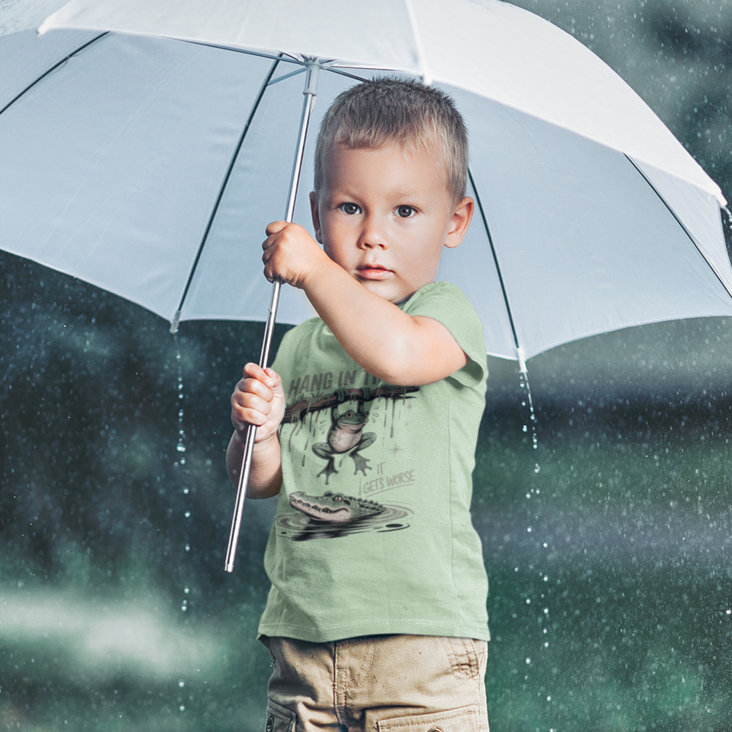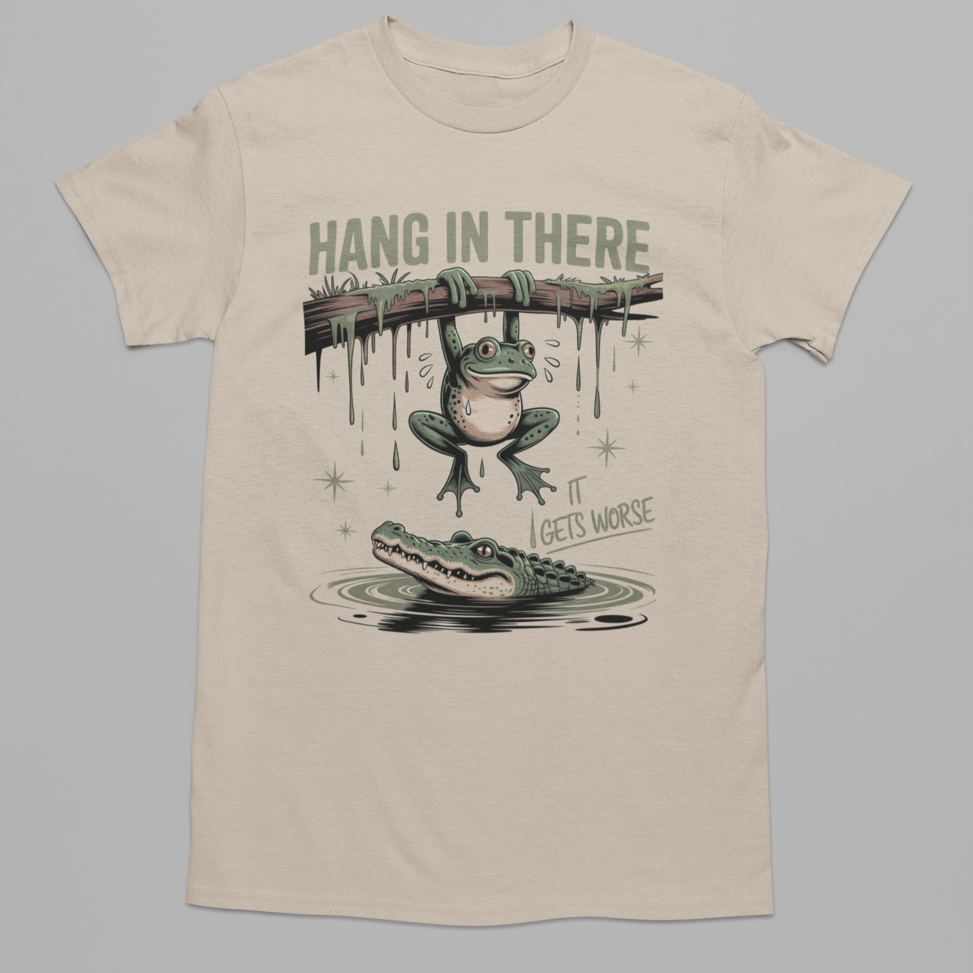 Embrace the unexpected with the Hang In There Graphic Tee. Featuring a quirky frog design, this shirt perfectly captures those offbeat days when you just need to keep going. Comfortable and stylish, it’s your new go-to for expressing resilience with a touch of humor. Hang in there—this tee’s got your vibe covered.