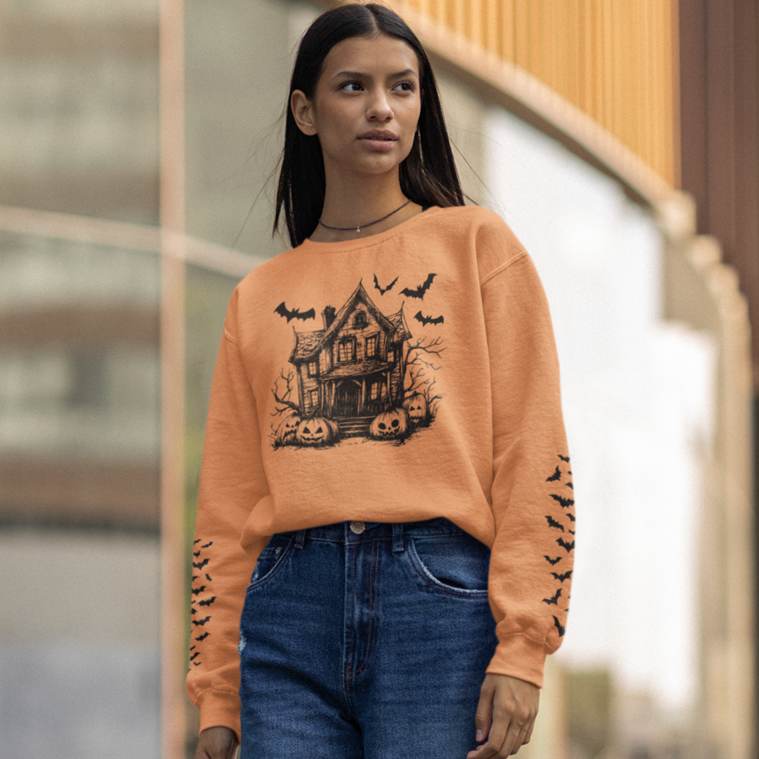 Step into spooky season with the Haunted Manor Graphic Sweatshirt. Featuring classic haunted house imagery and vintage Halloween style, this sweatshirt is perfect for those who love timeless spooky vibes. Cozy and stylish, it’s an ideal way to celebrate the season in comfort and flair.