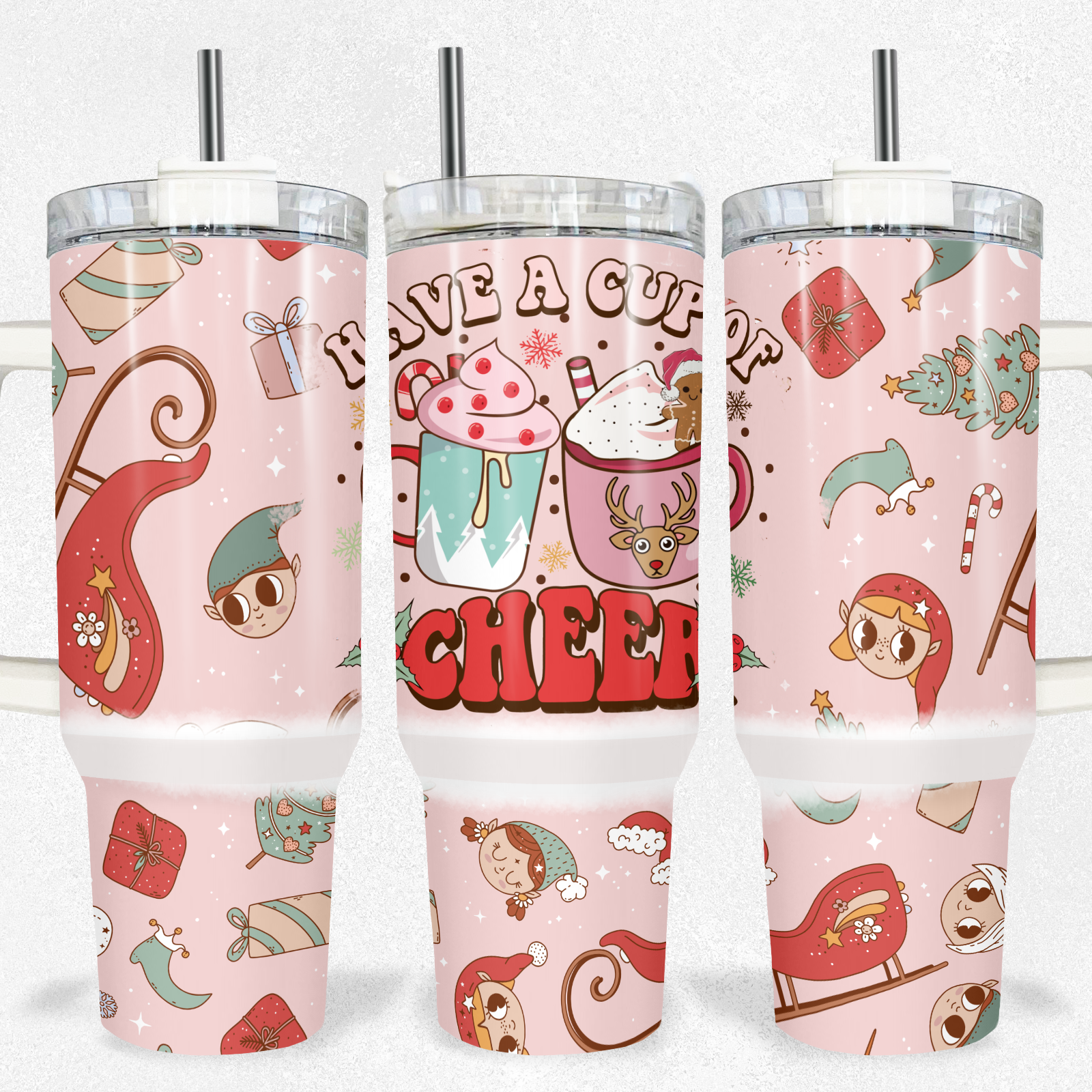 Spread holiday joy with our “Have a Cup of Cheer” Christmas tumbler! This adorable tumbler features a pink background with festive designs of hot cocoa mugs, cheerful elves, reindeer, and holiday decorations. Made from durable stainless steel, it keeps drinks hot or cold for hours—perfect for sipping warm cocoa or a chilled holiday beverage. With its whimsical artwork and playful holiday vibe, this tumbler makes a fantastic gift or a fun addition to your own Christmas collection. Bring a little extra cheer to your sips all season long!