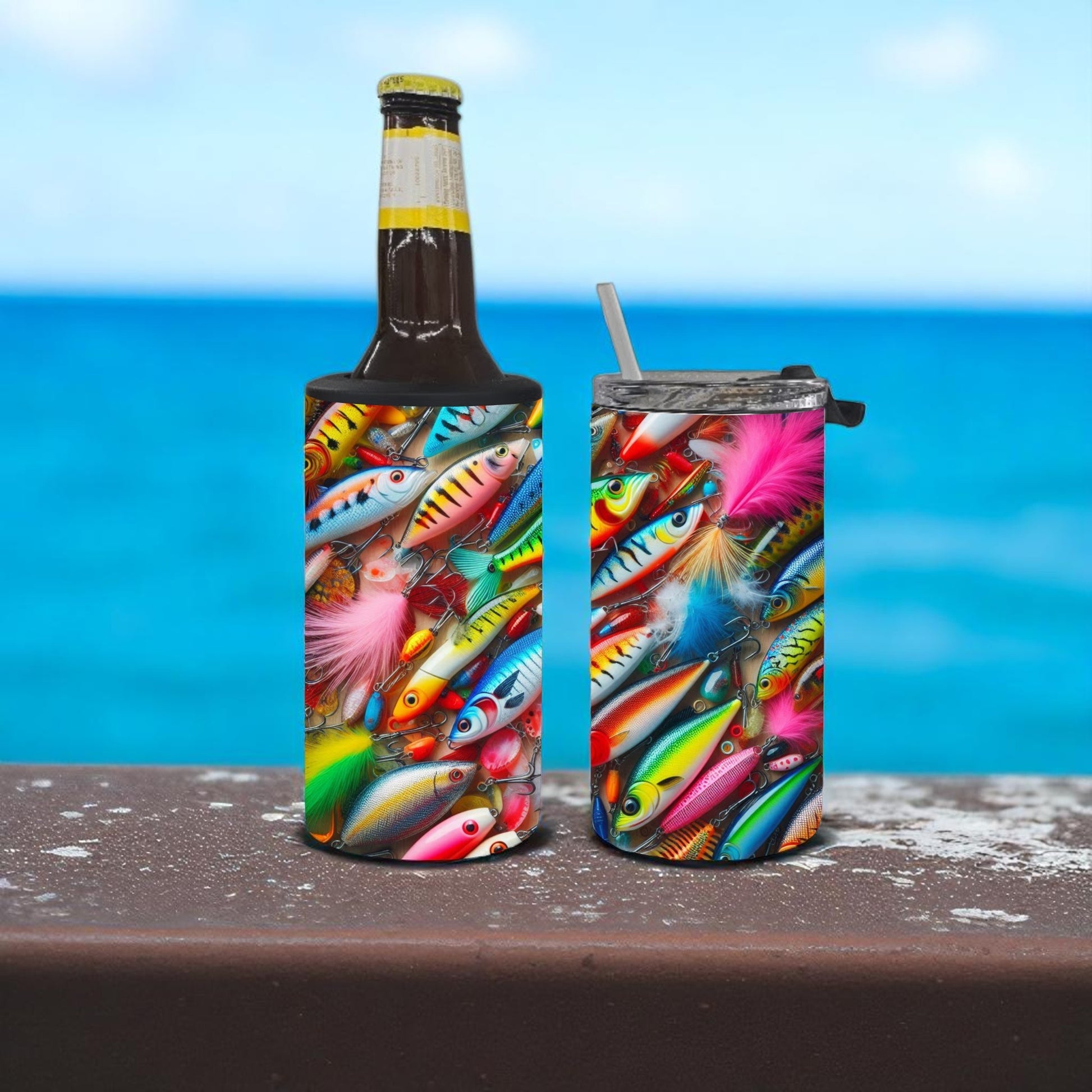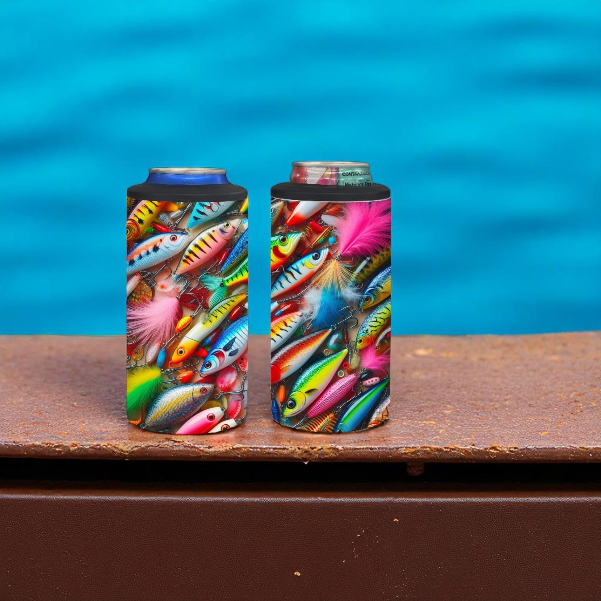 Make waves with the Hooked on Color 4-in-1 Can Cooler Cup, featuring a vibrant fishing lure collage that’s sure to reel in compliments.
