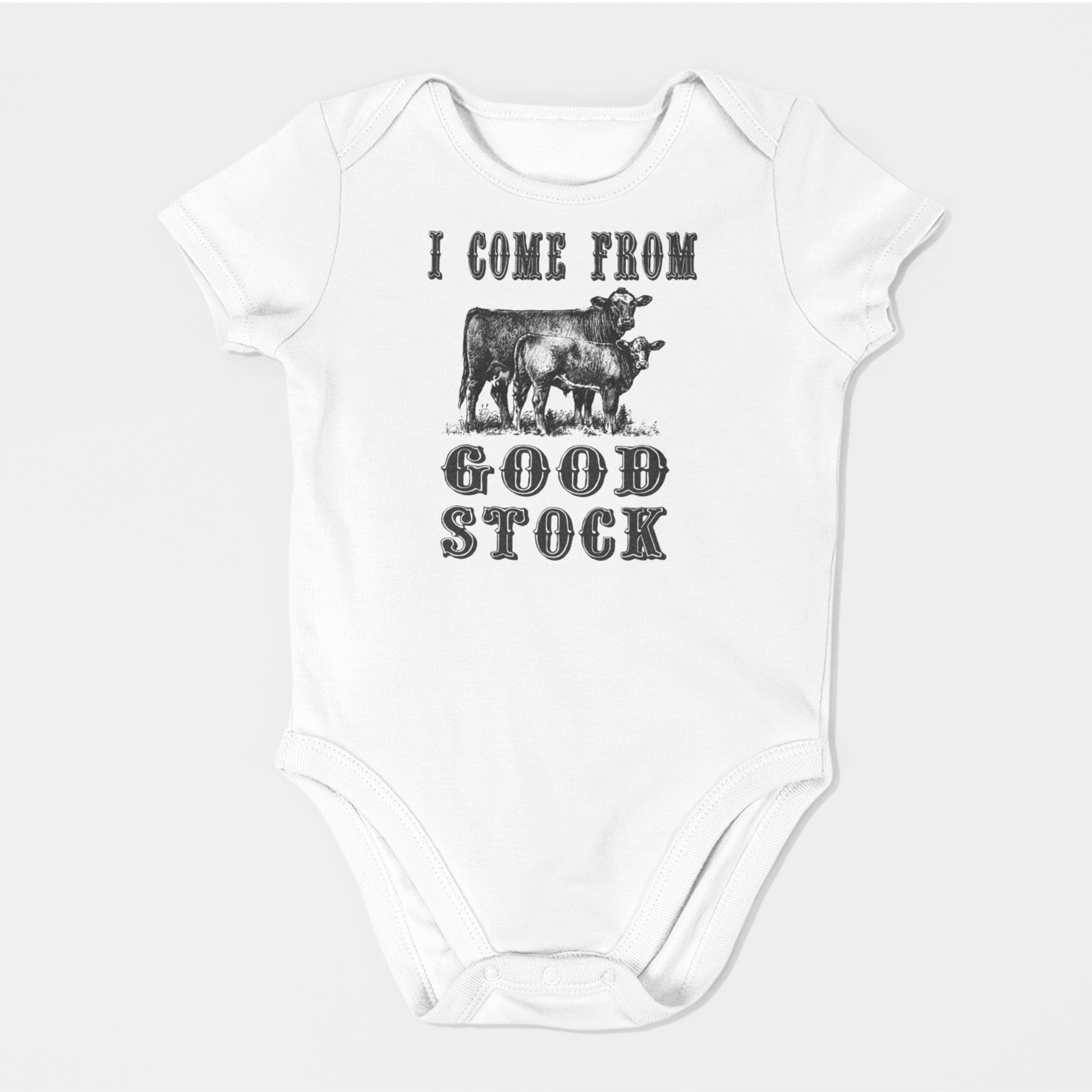 This delightful infant bodysuit features the playful phrase "I Come From Good Stock," paired with a charming image of farm animals. Ideal for babies with a rustic or agricultural heritage, or those who simply enjoy a fun and wholesome style. Crafted from soft, baby-friendly material, it ensures comfort throughout the day, making it perfect for playtime or family photos. The vintage-inspired design adds a touch of timeless appeal, making this bodysuit a cute and cozy choice for any little one's wardrobe.