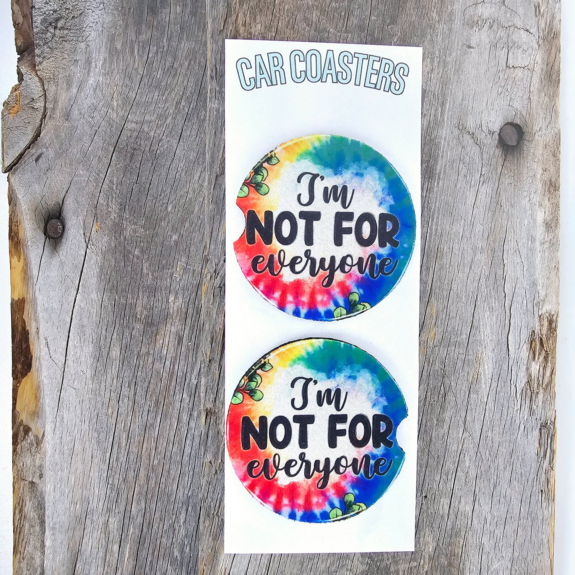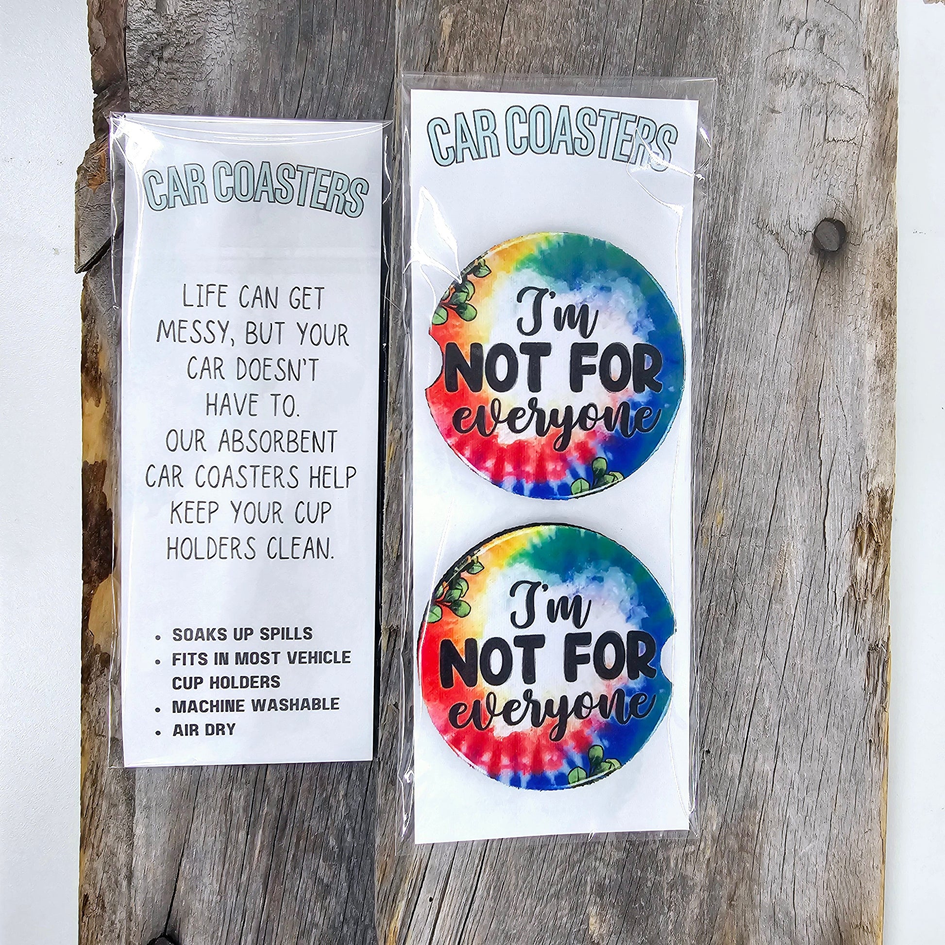 Our "I'm Not For Everyone" car coasters are the perfect accessory for those who take pride in their unique individuality. Splashed with a vibrant tie-dye design and bold statement, these coasters add a pop of personality to any car interior while providing a practical function. They're crafted to absorb drips and spills, ensuring your cup holders remain pristine. The universal size fits most vehicle cup holders, and when they need cleaning, simply machine wash and air dry. With each pack containing two coasters, they make a fabulous gift for anyone who celebrates their distinctiveness and wants to keep their car just as fresh and original as they are.