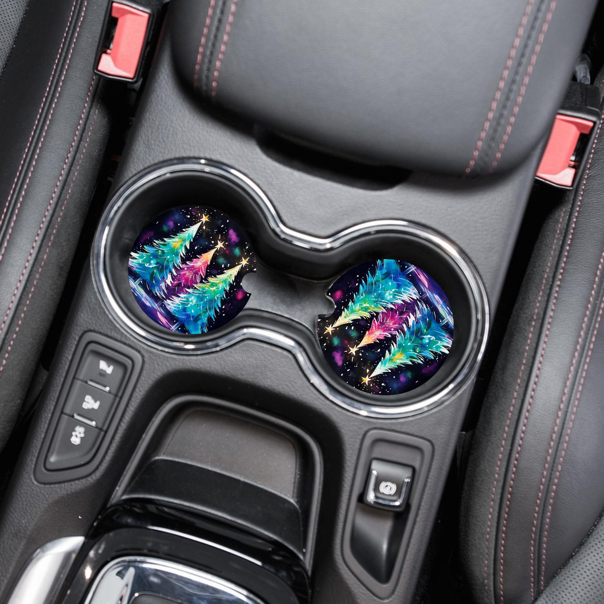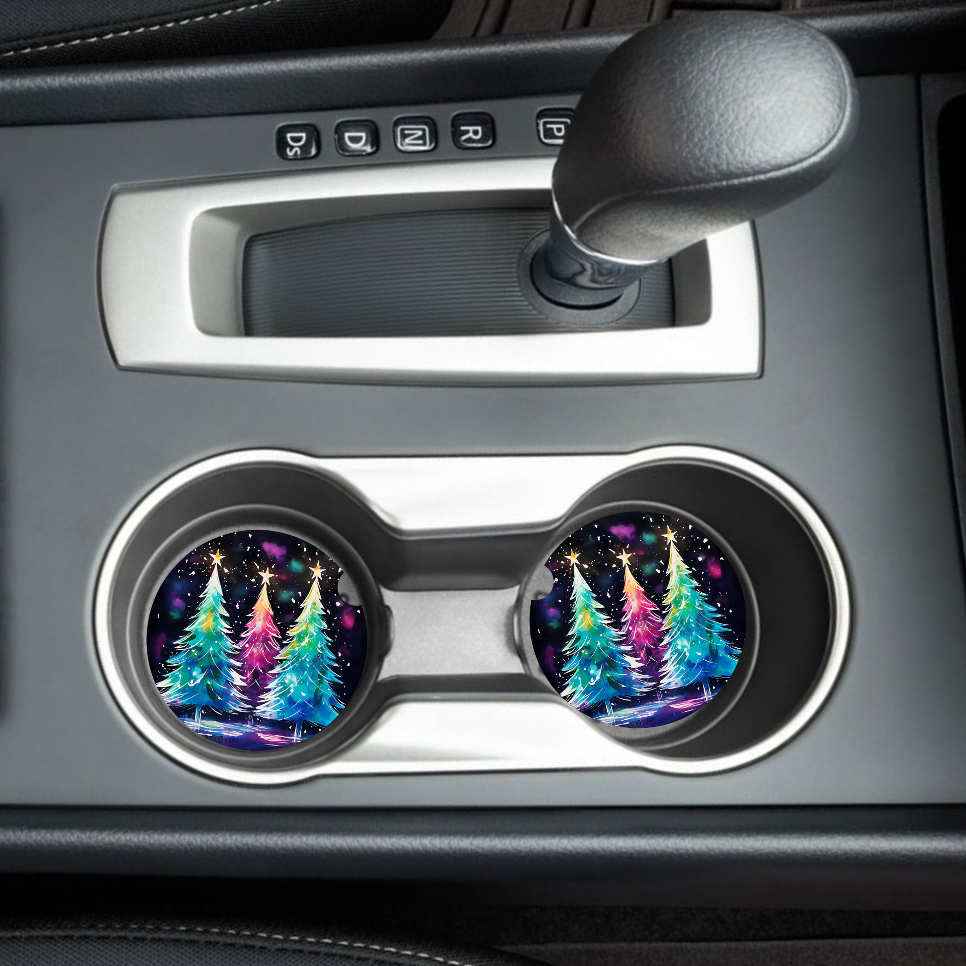 Transform your car with the Northern Light Pines Car Coaster, featuring vibrant, glowing pines set against a starry sky. This design captures the enchanting magic of the northern lights while protecting your cup holder from spills. Perfect for adding a luminous holiday touch to every journey.