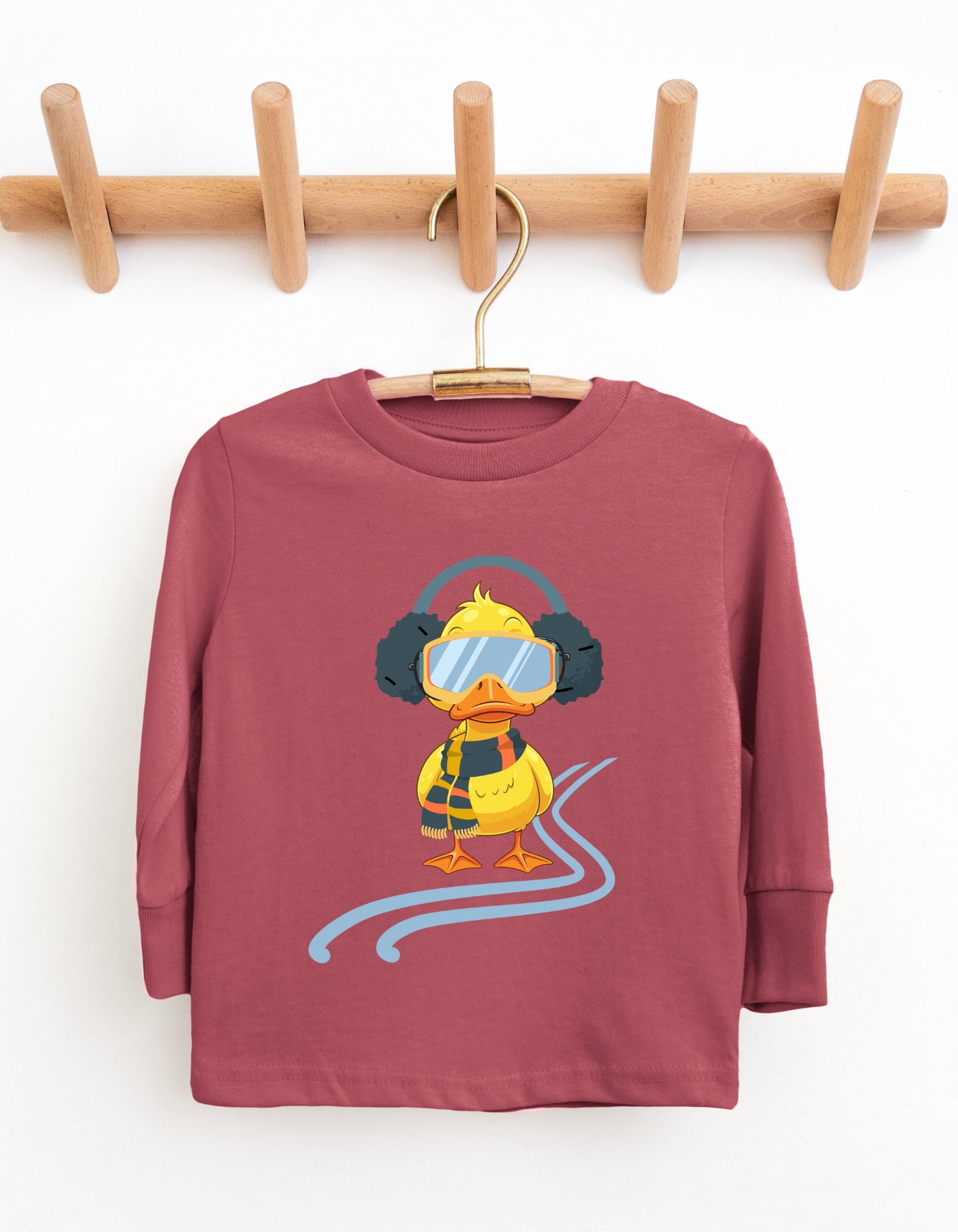 Let’s quack about cute! 🦆 Our “One Cool Duck” long sleeve tee is perfect for little ones who love a splash of personality. Featuring a stylish duck rocking earmuffs, a scarf, and ski goggles, this fun winter design brings playful charm to any cold-weather outfit.