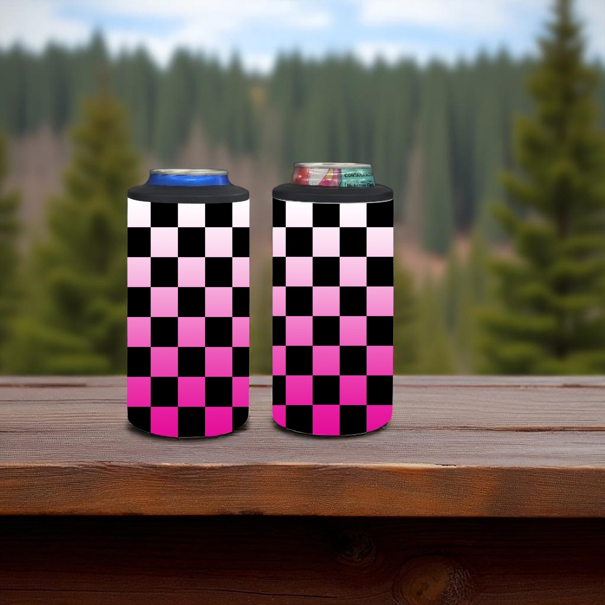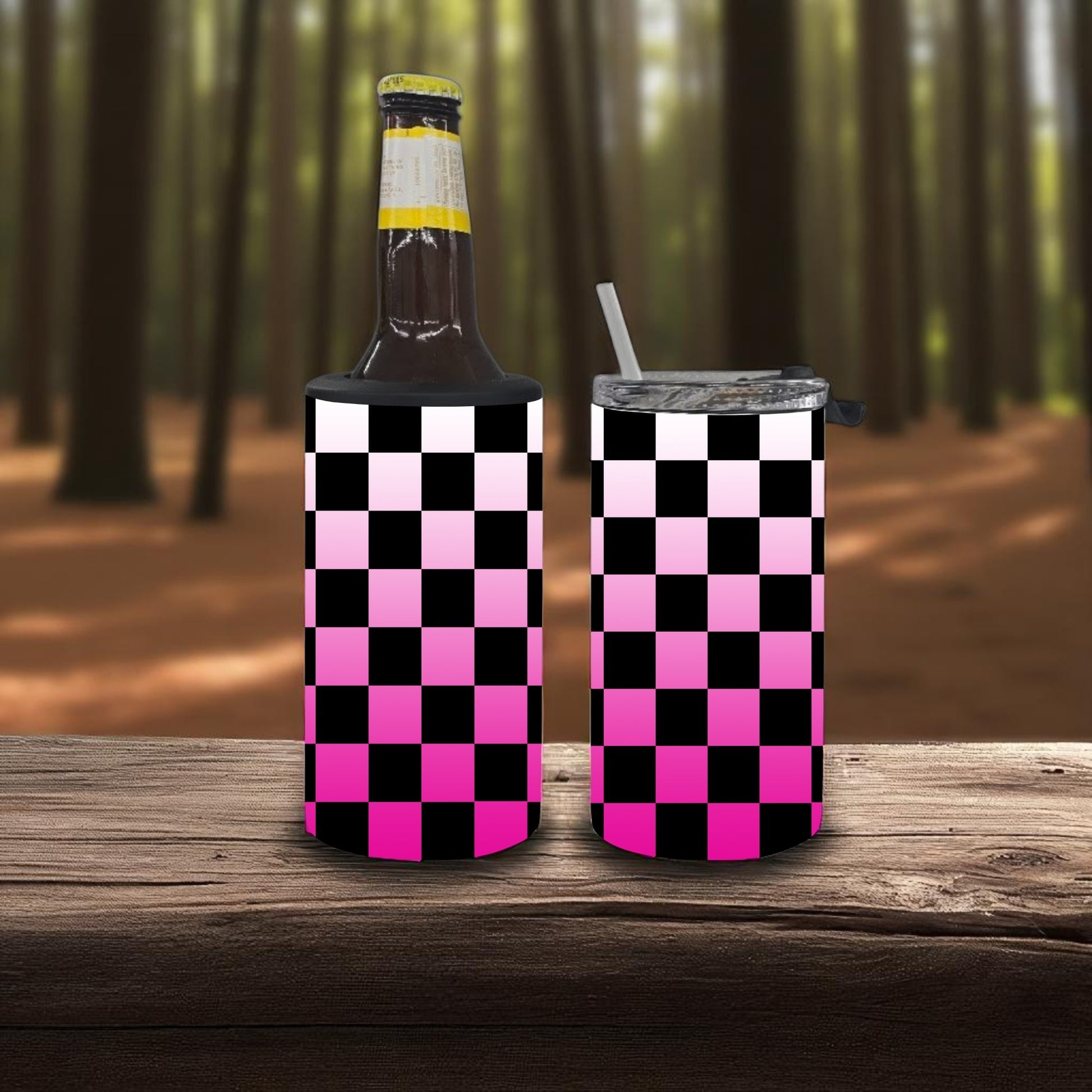 Make a statement with the Pink Fade Checker 4-in-1 Can Cooler Cup, where soft to bold pinks fade seamlessly down a striking black checkerboard.