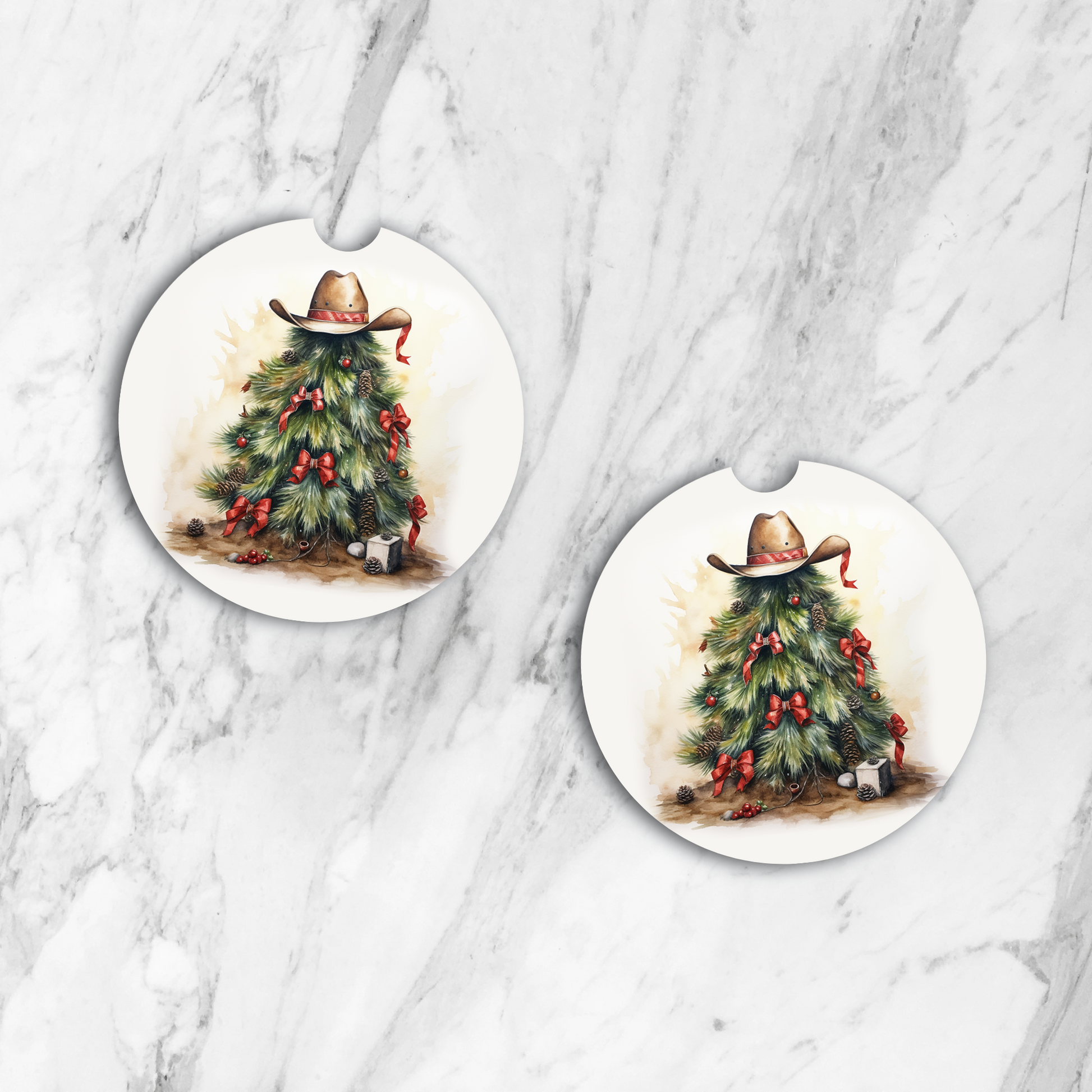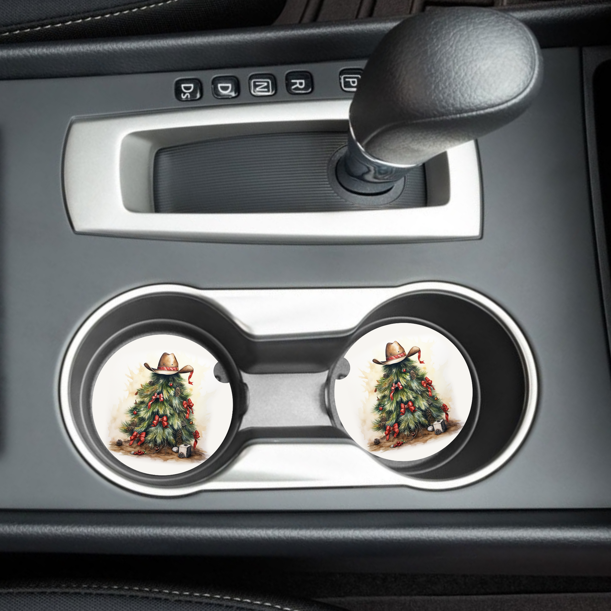Bring rustic holiday spirit to your car with the Prairie Pine Cheer Car Coaster. Featuring a cowboy-themed Christmas tree topped with a hat, this design captures the warmth and charm of the prairie. It protects your cup holder from spills while adding festive cheer with a unique western twist, perfect for celebrating the season in style.