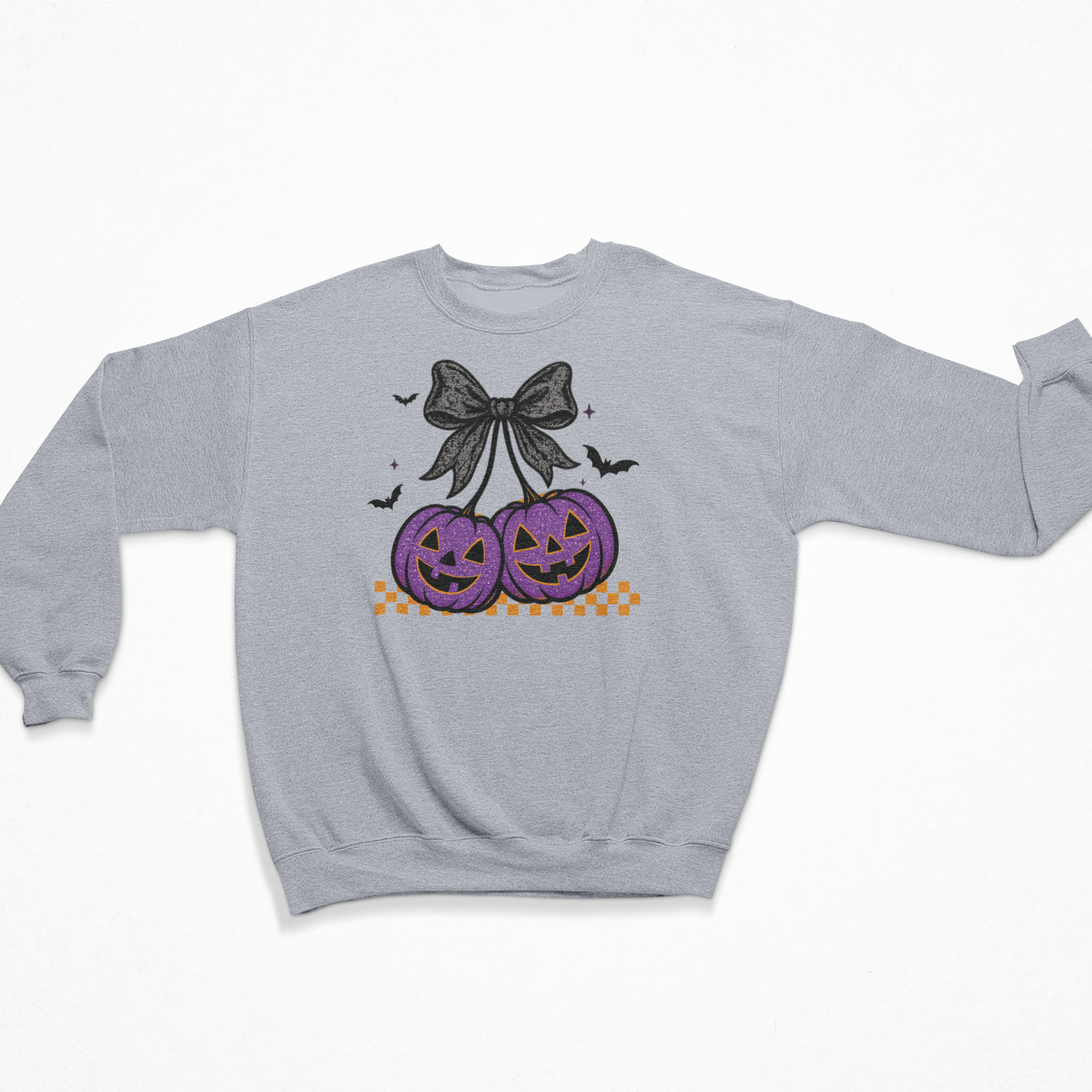 The Pumpkin Princess Youth & Toddler Sweatshirt features two grinning purple pumpkins, sparkling accents, bats, and a big bow for a playful yet glamorous Halloween look. Perfect for little ones who want to celebrate the season with style and fun.