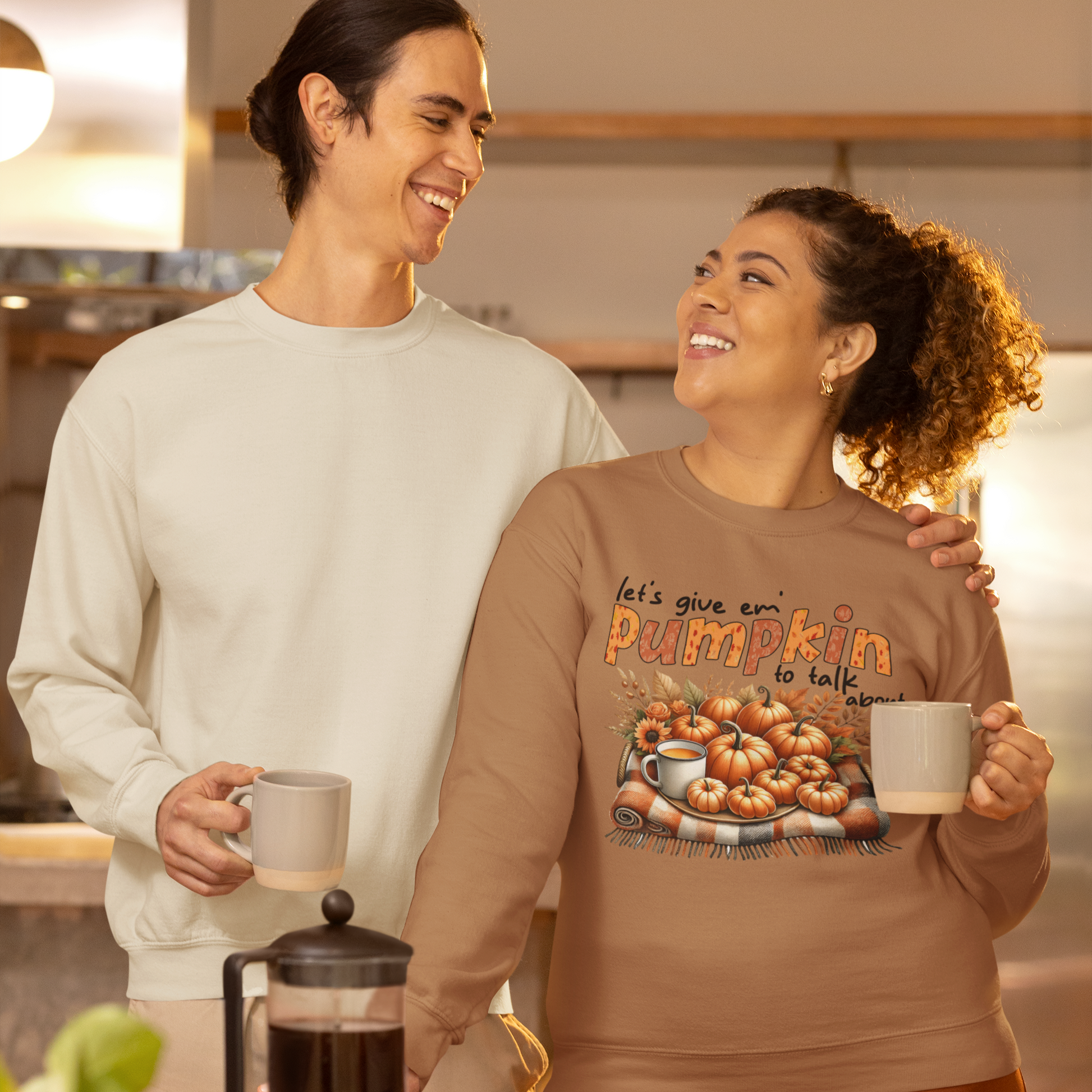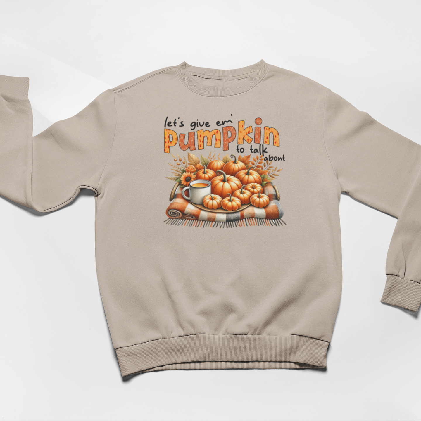Stay warm and festive with the Pumpkin Talk Graphic Sweatshirt, featuring the playful phrase “Let’s give ’em pumpkin to talk about” alongside a cozy pumpkin and latte graphic. Perfect for pumpkin spice lovers, this shirt blends witty charm with seasonal comfort to keep you stylish all fall.