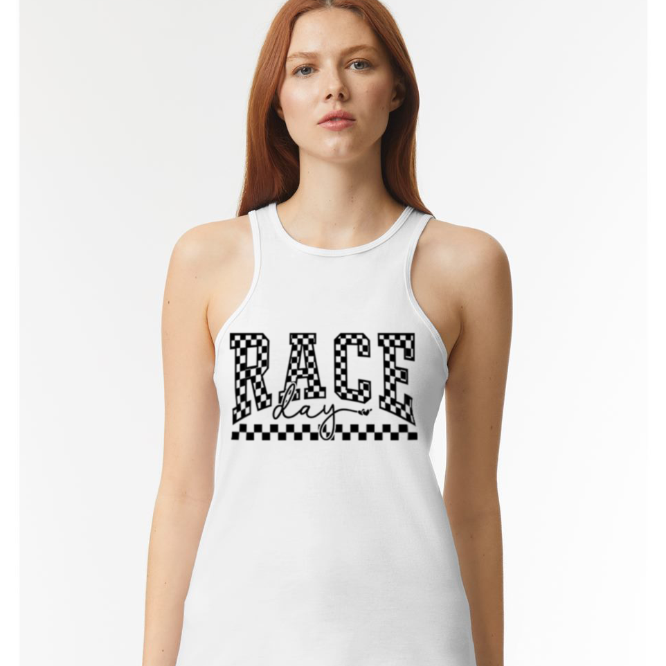 Rev up your style game with our "Race Day" graphic tank. Perfect for fans who want both boldness and comfort, this classic-fit tank features eye-catching checkered lettering and playful script. Made from a soft cotton-blend fabric, it's the perfect choice for a laid-back yet stylish race day look. Vroom vroom!