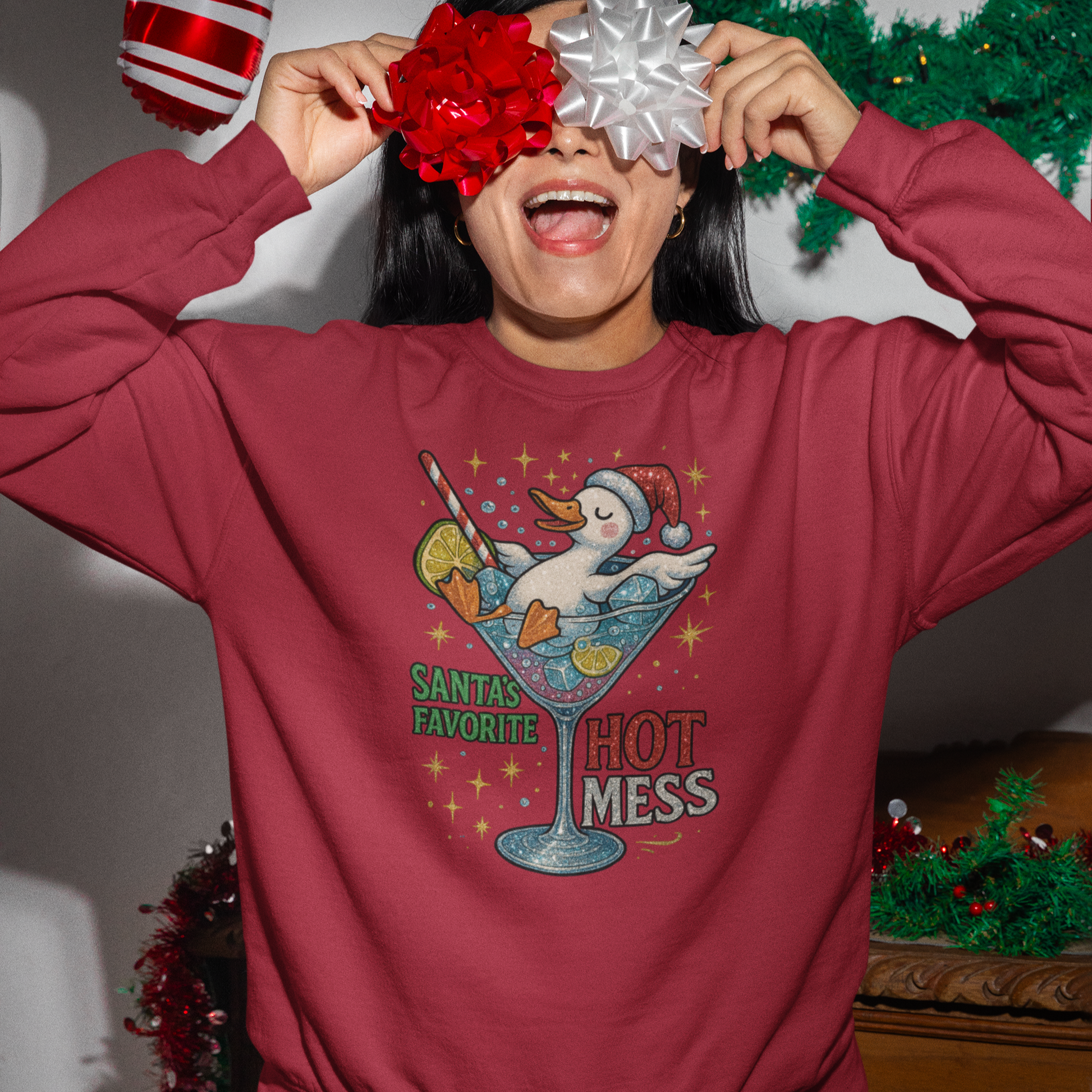 Embrace the holiday spirit with the Santa’s Favorite Hot Mess Adult Graphic Sweatshirt. This cozy sweatshirt features a playful design of a duck relaxing in a martini glass, making it the perfect conversation starter for parties and gift exchanges. Soft and comfortable, it keeps you warm while adding a touch of humor to your festive wardrobe. Ideal for curling up with your favorite holiday drink while showing off your fun, festive side.