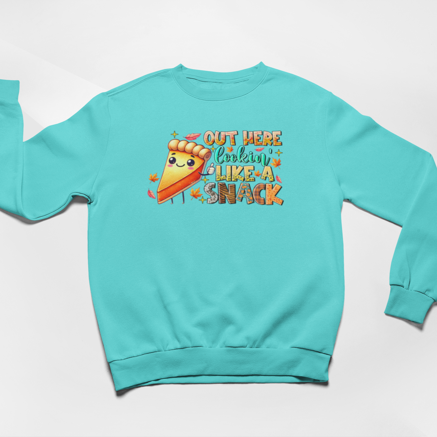 Celebrate your holiday spirit with the Snack Attack Graphic Sweatshirt, showcasing a cheerful slice of pumpkin pie and the witty phrase “Out Here Lookin’ Like a Snack.” This playful design adds fun to your festive wardrobe while keeping you cozy. Perfect for spreading smiles and seasonal cheer wherever you go.