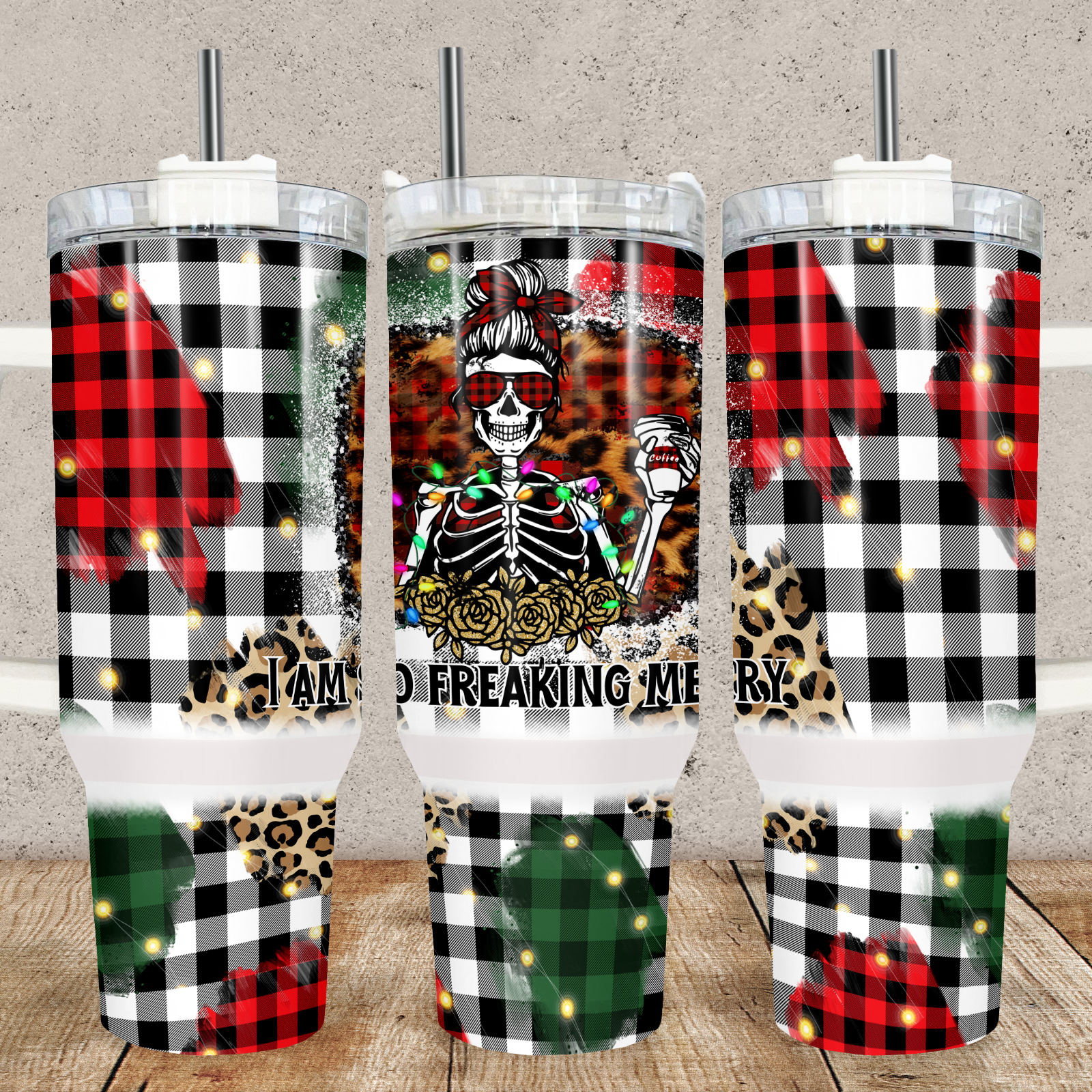 Bring edgy holiday vibes to your drinkware with our “I’m So Freaking Merry” Christmas tumbler! This bold design features a sassy skeleton decked out in festive lights, red sunglasses, and a holiday coffee cup, set against a background of buffalo plaid, leopard print, and rustic splashes of red and green. Made from durable stainless steel, this tumbler keeps your drinks hot or cold, perfect for staying merry (and caffeinated) all season long. Ideal for those with a rebel spirit, this tumbler makes a fun and unique gift or a standout addition to your holiday collection.