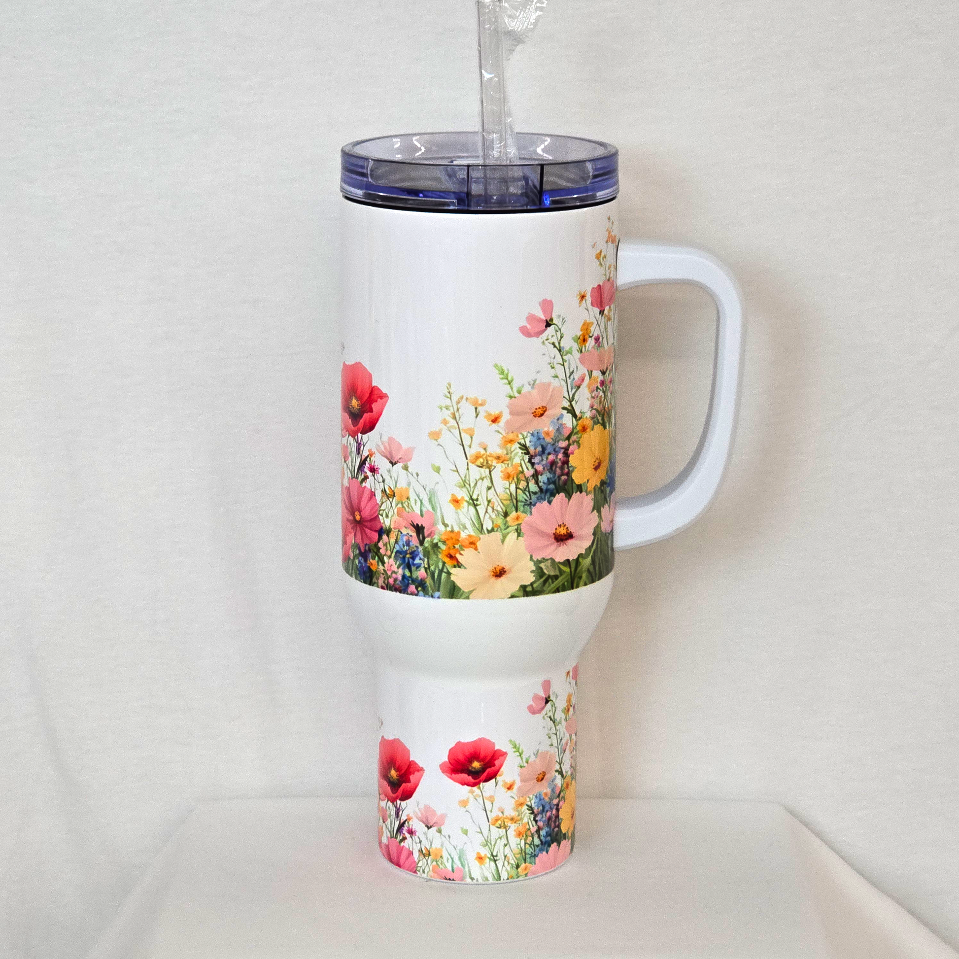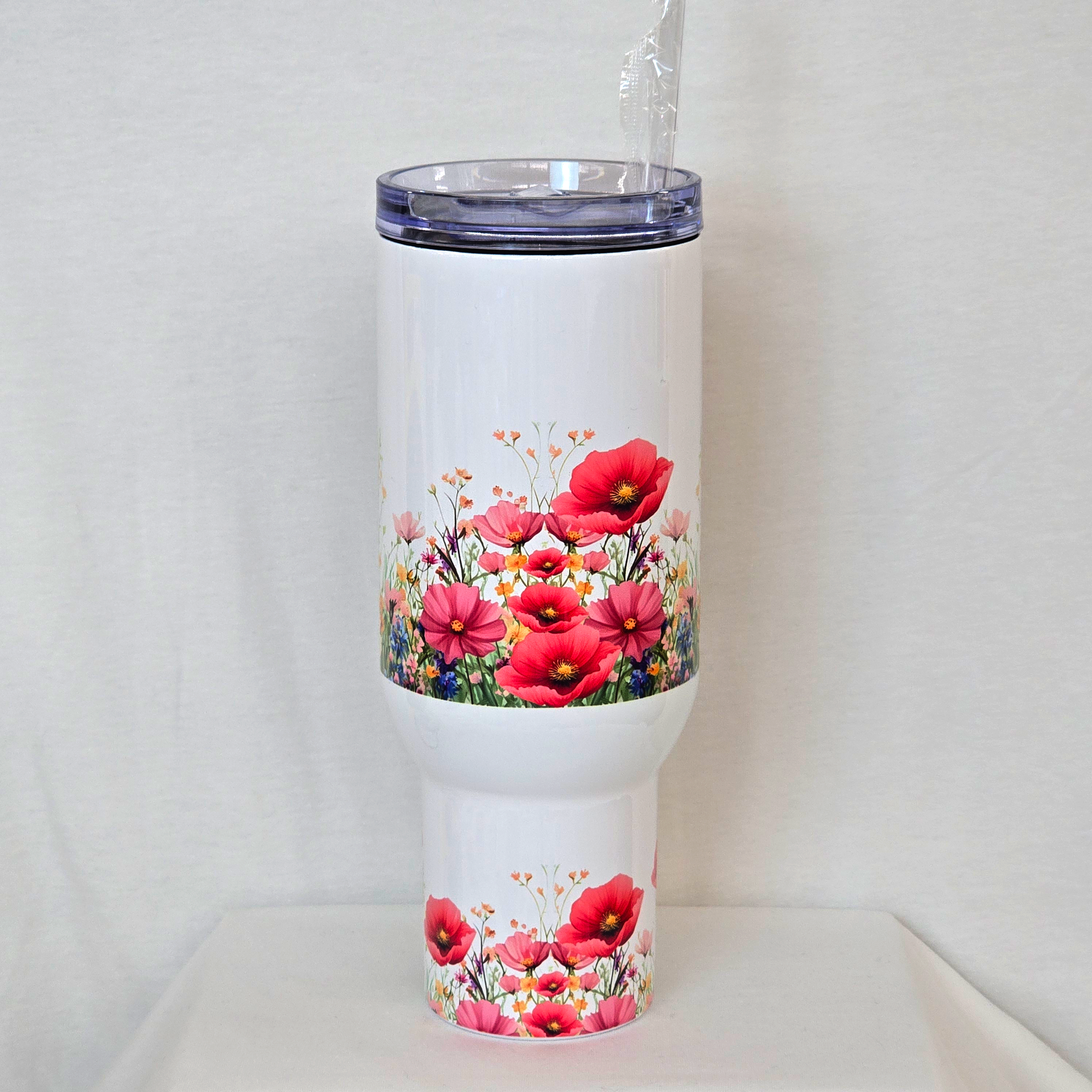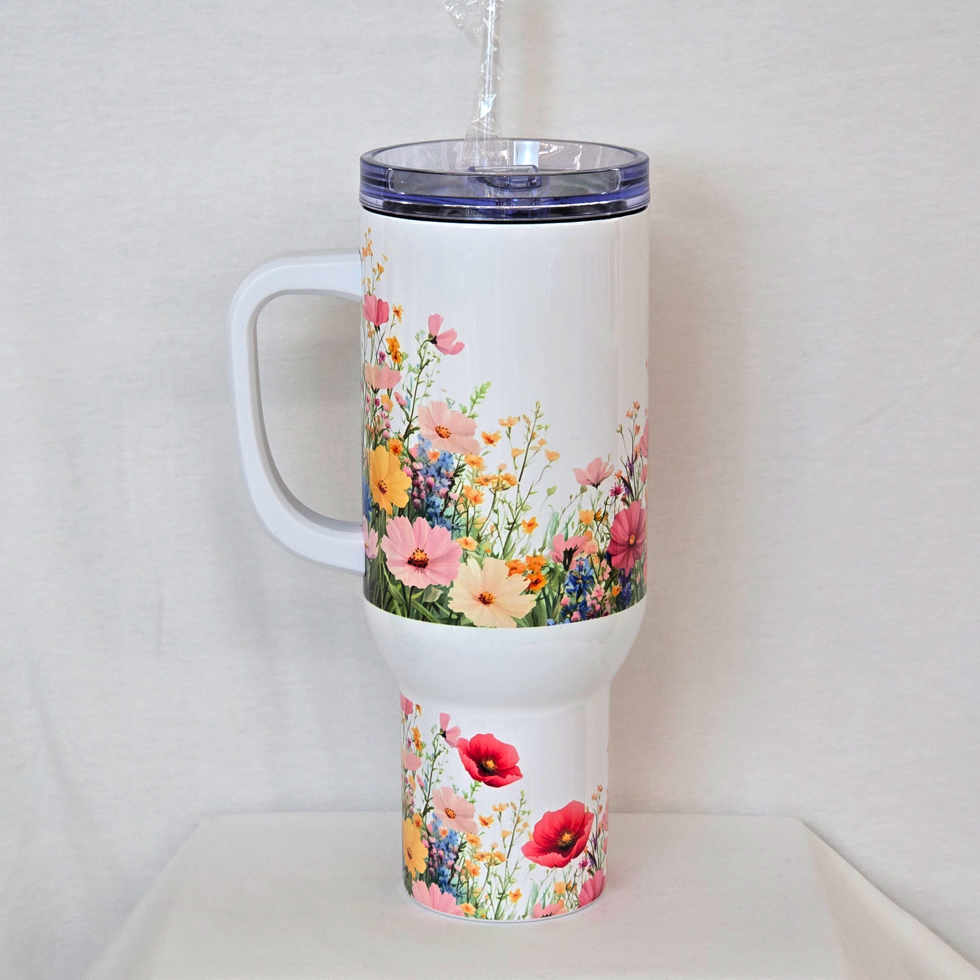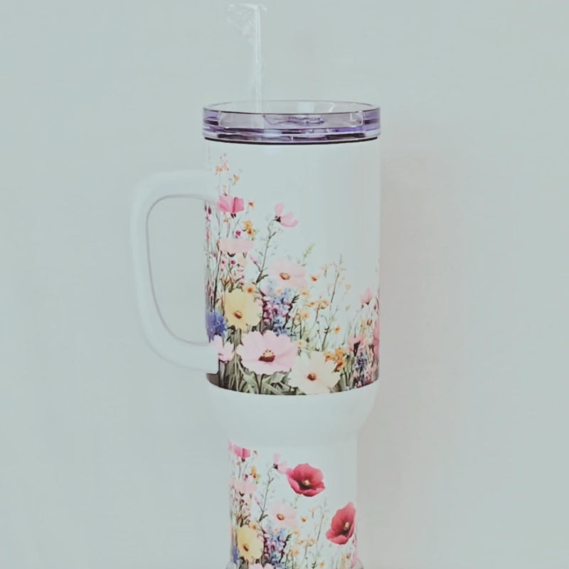Sip in style with our Spring Meadow 40 oz Tumbler, where wildflowers bloom with every pour. This double-walled stainless steel tumbler keeps drinks cold for hours and fits perfectly in car cup holders—ideal for road trips, workdays, and everything in between. Featuring a vibrant floral wrap, a clear lid, and an optional handle for easy grip, it's the prettiest way to stay hydrated all season long.