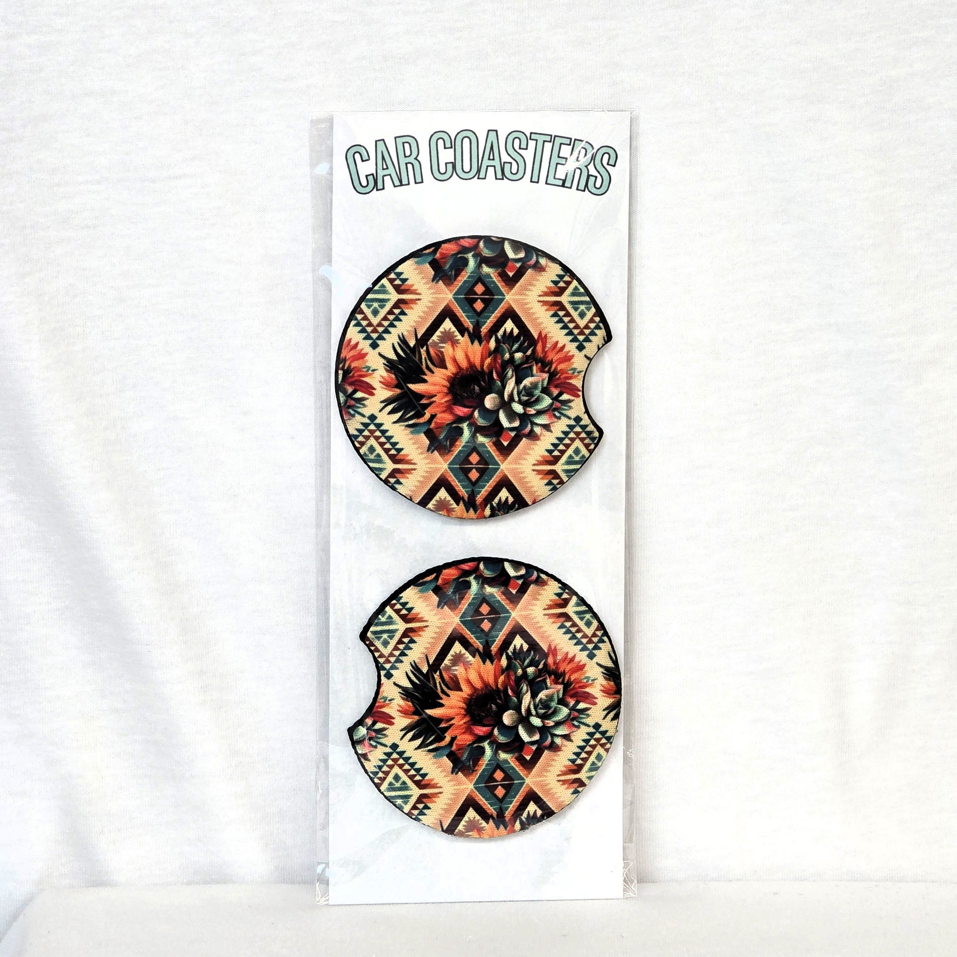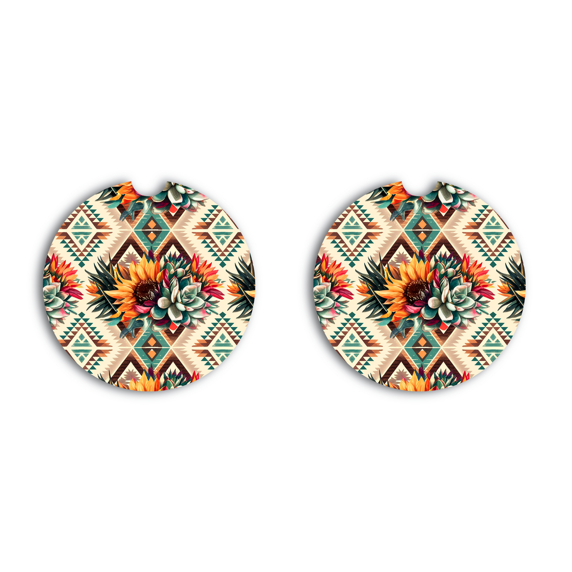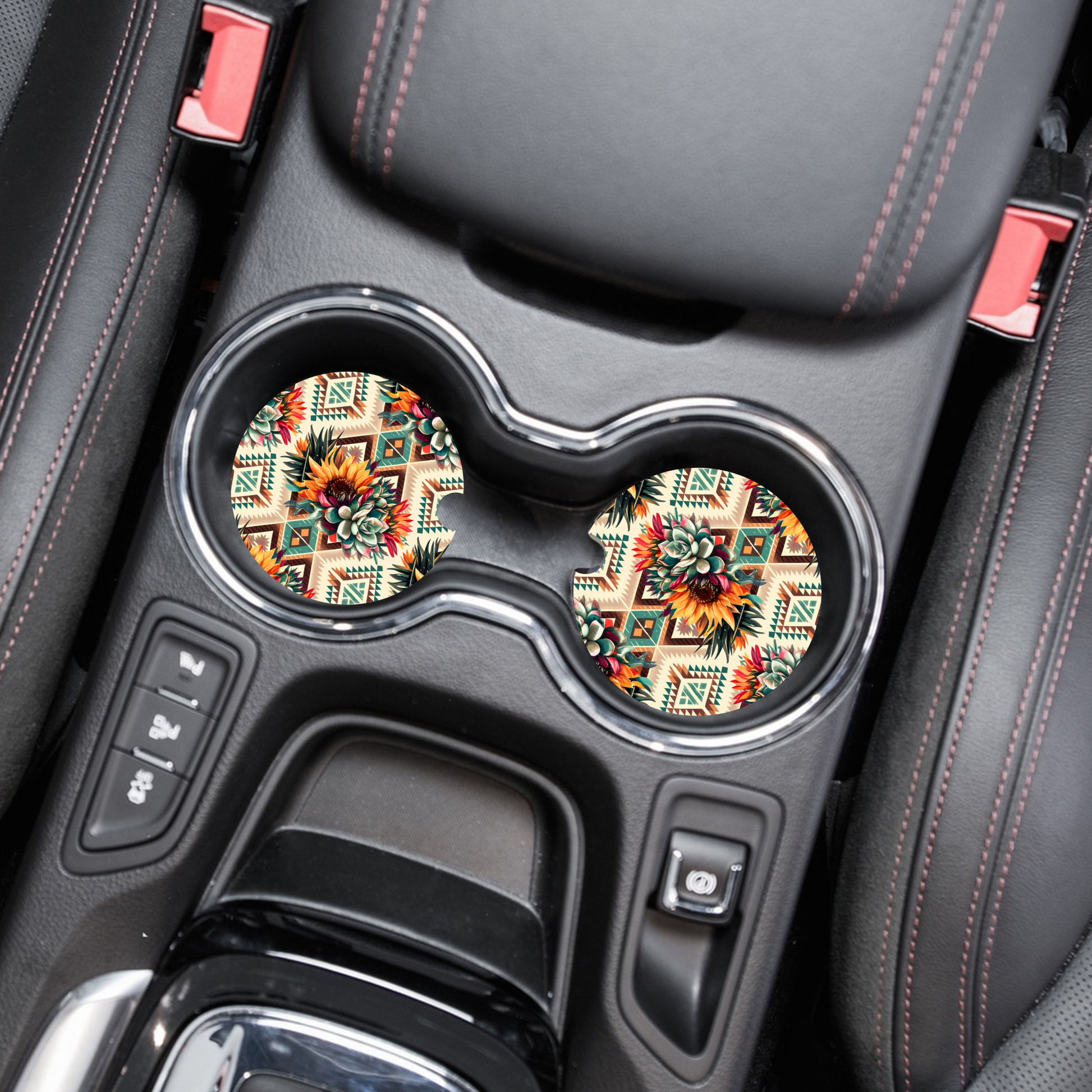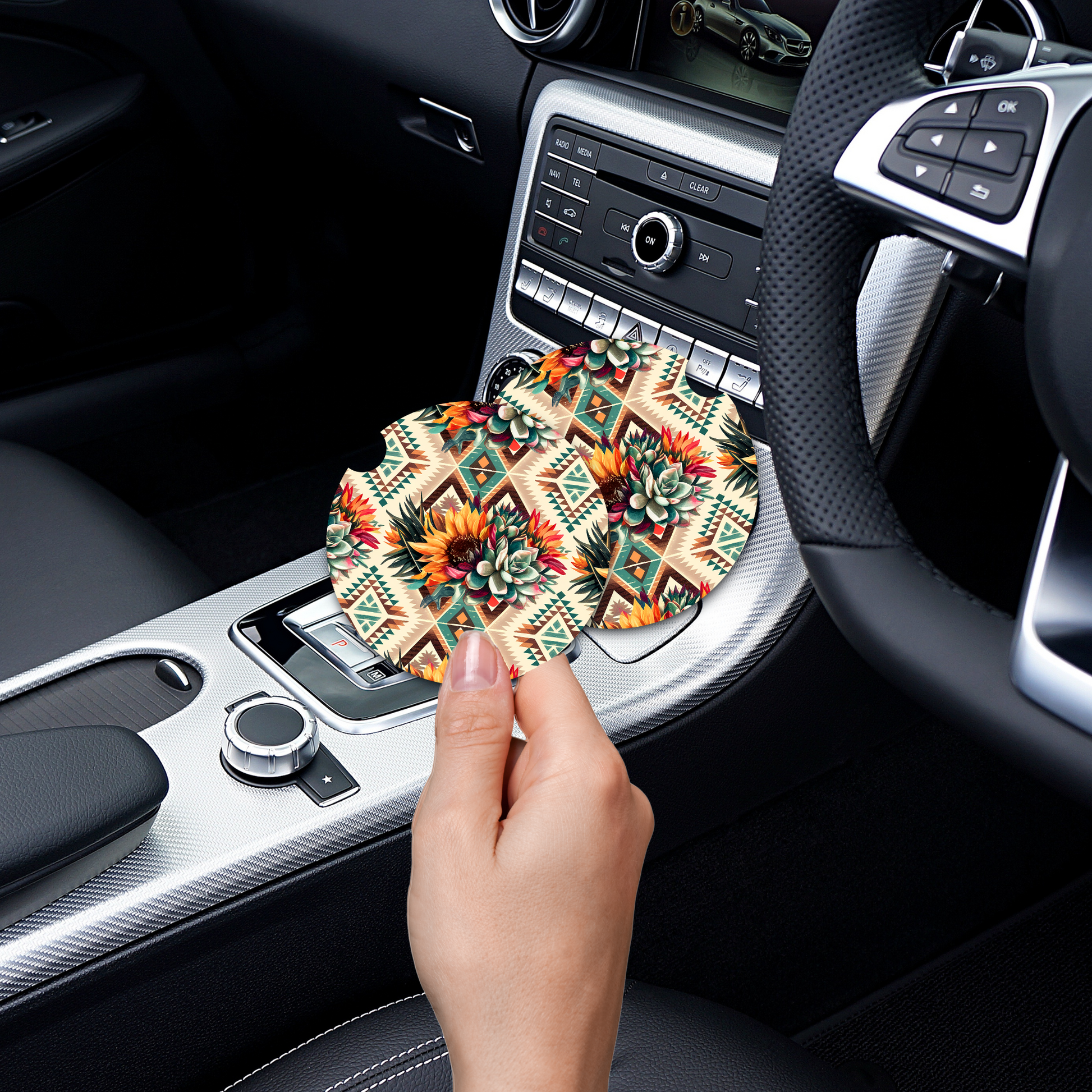 The Southern Bloom Car Coaster presents a masterfully curated composition that celebrates the sophisticated beauty of the American Southwest. This exquisite design harmoniously weaves together golden sunflowers, architectural succulents, and refined tribal motifs, creating an automotive accessory that transcends mere functionality to become a statement of cultivated taste.