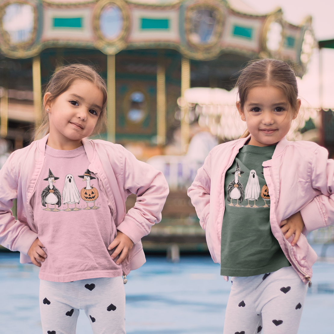Celebrate fall with the Goose Bumps Youth & Toddler Graphic Tee, featuring a hilarious trio of geese dressed in festive Halloween costumes. This playful design adds charm and laughter to your child's wardrobe, making it the perfect tee for seasonal fun and cozy comfort.