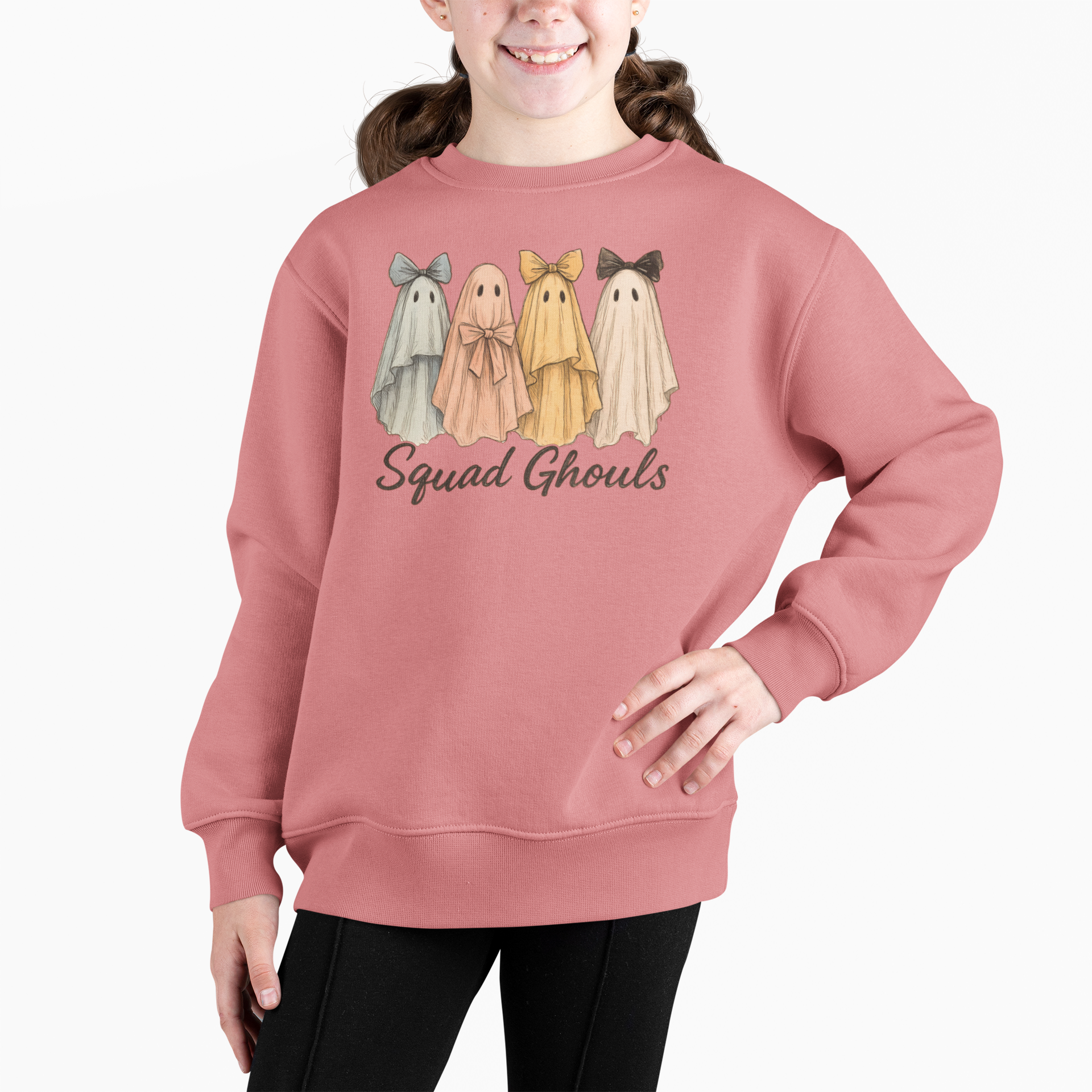 Celebrate spooky season in style with the Squad Ghouls Youth & Toddler Sweatshirt. Featuring four pastel ghost friends adorned with bows and vintage lace, this charming design is perfect for besties who love to share the fun. Cozy and cute, it’s a must-have for your little one’s fall wardrobe.