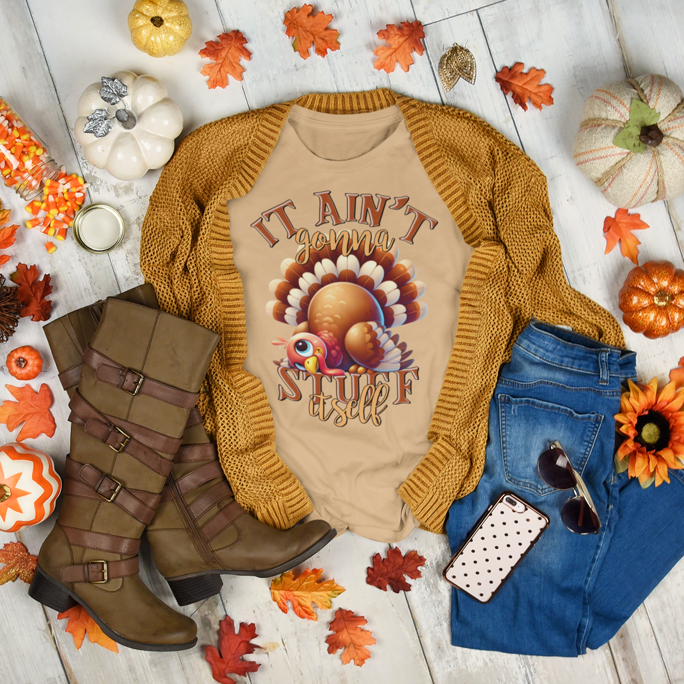 Make a bold statement this holiday season with the Stuff It Graphic Tee. Featuring a proud turkey and the cheeky phrase “It Ain’t Gonna Stuff Itself,” this shirt is sure to spark laughter and conversation at the dinner table. Perfect for adding humor and festive flair to your celebration.