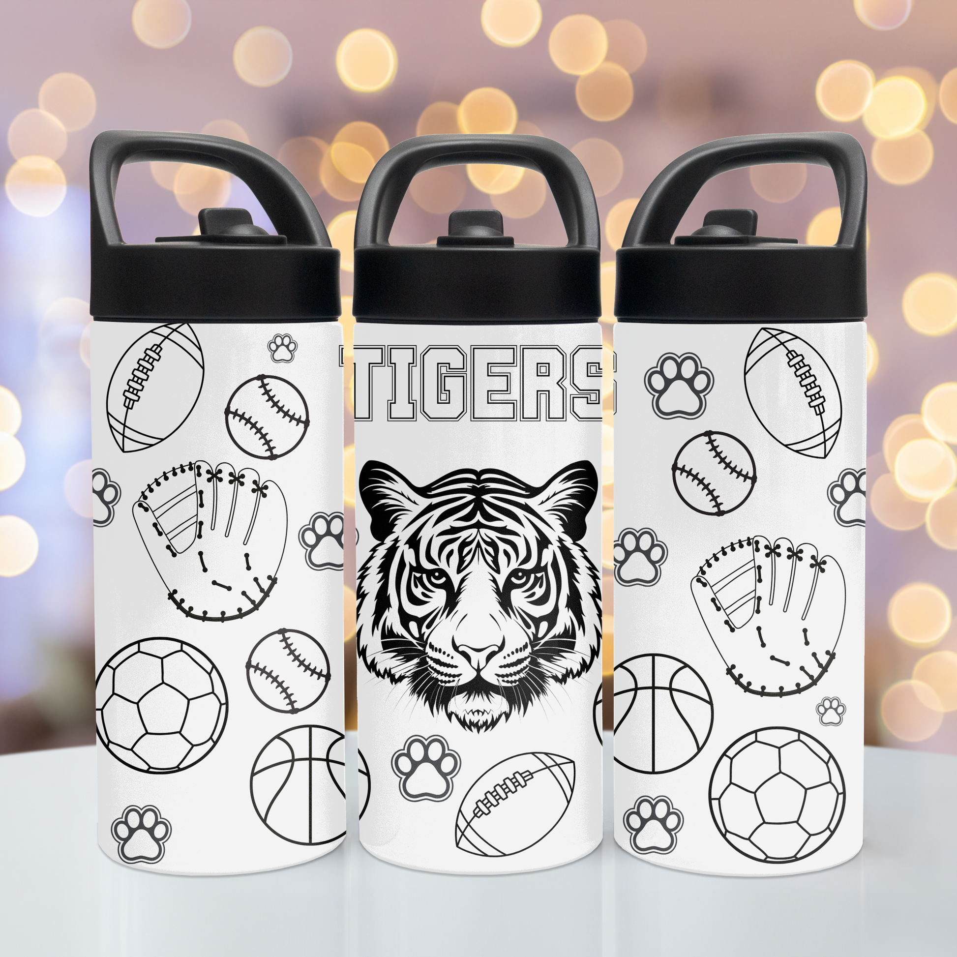 Score big with this **sports-themed coloring tumbler**! Featuring basketballs, soccer balls, footballs, and a bold tiger design, this tumbler is perfect for young sports enthusiasts. Kids can customize it with their favorite team colors, making it a personal and fun keepsake.