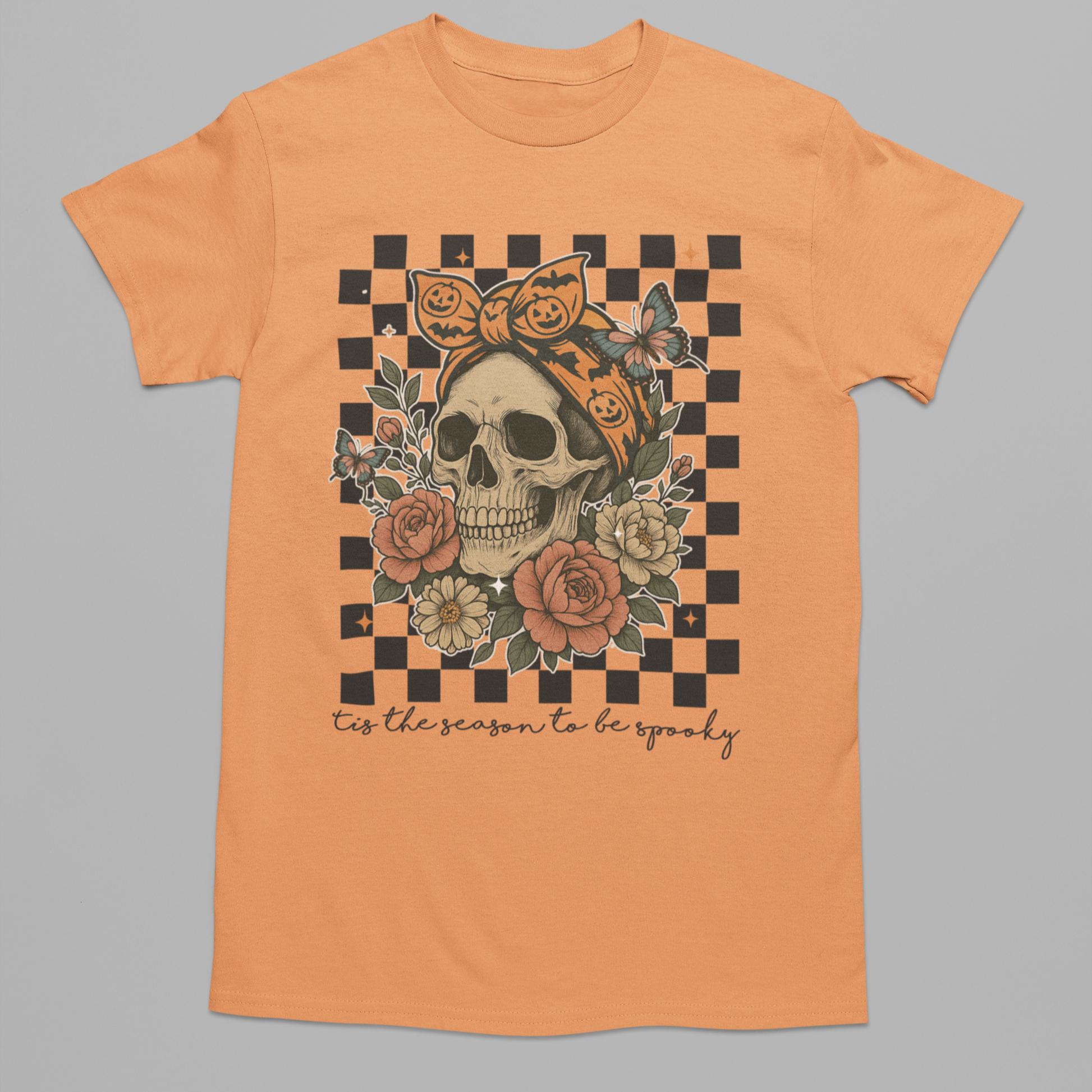 Celebrate spooky season in style with the Tis the Season to Be Spooky Graphic Tee. Featuring a pumpkin bandana, floral skull, and checkerboard accents, this shirt blends vintage fun with Halloween flair. Perfect for those who want to embrace the festive spirit with a unique, eye-catching look.
