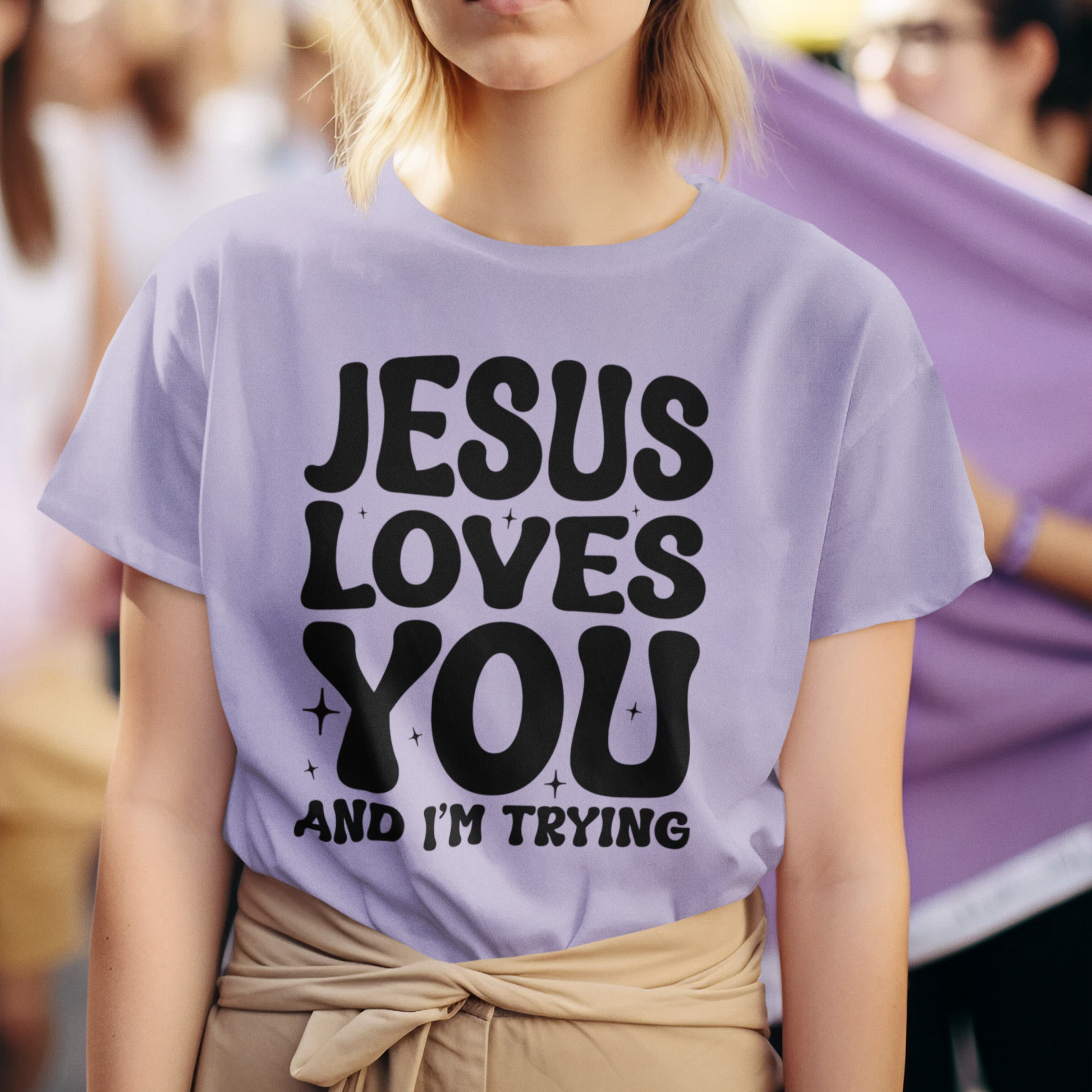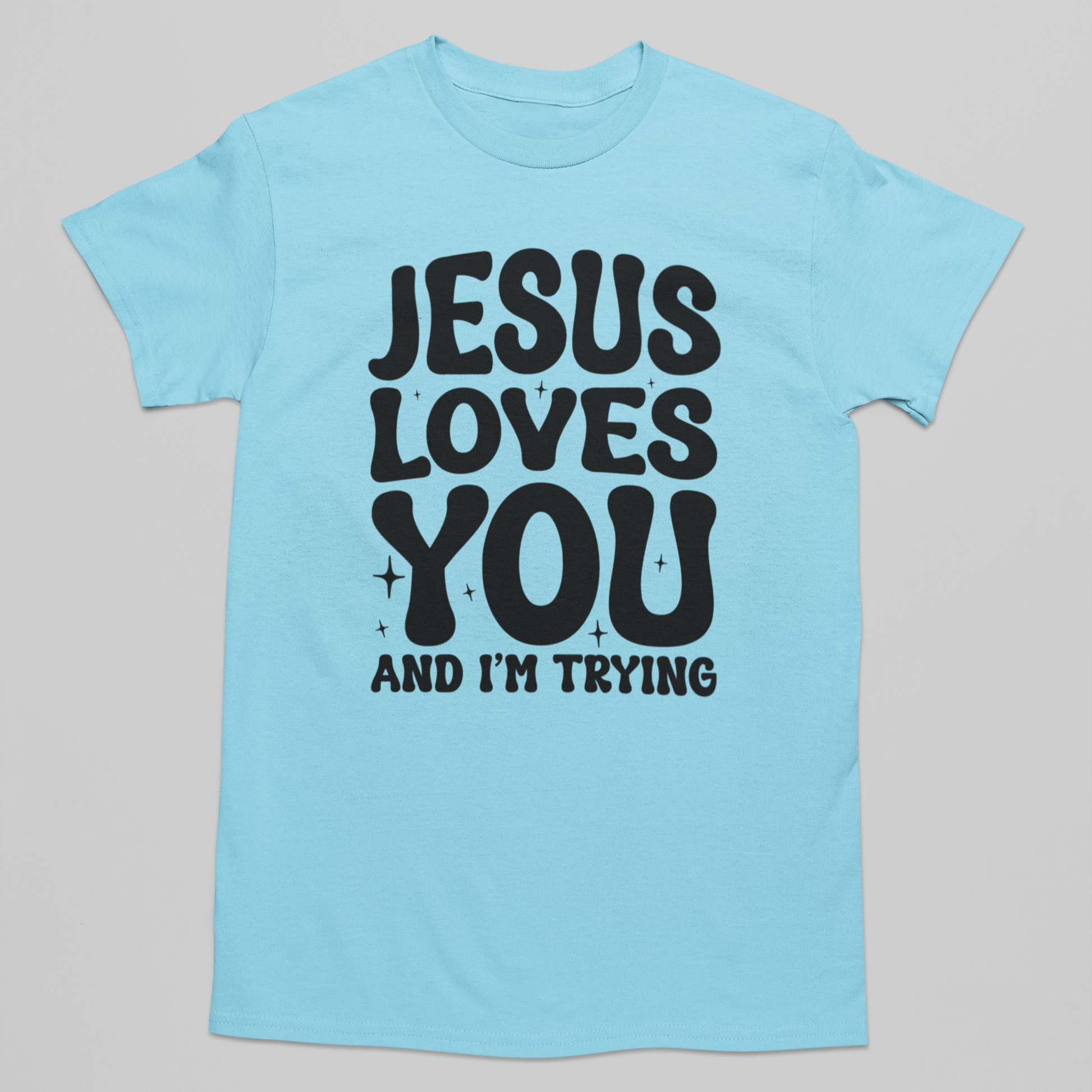 Show off your faith with a wink in the Trying My Best Graphic Tee. Featuring the cheeky message, “Jesus loves you…and I’m trying,” this shirt is perfect for believers who mix a little sass with plenty of grace. It’s a fun, lighthearted way to remind everyone that doing your best is what truly counts.