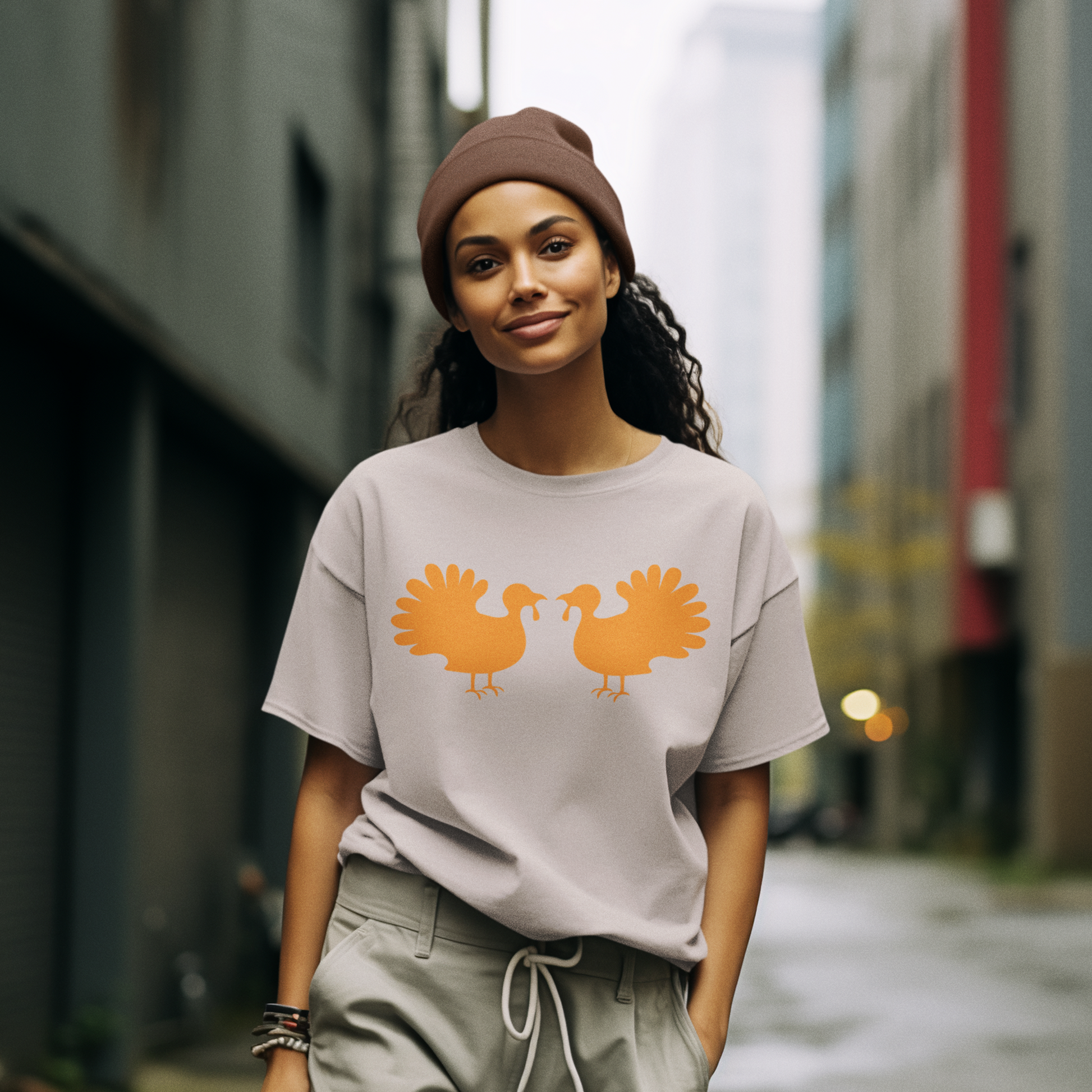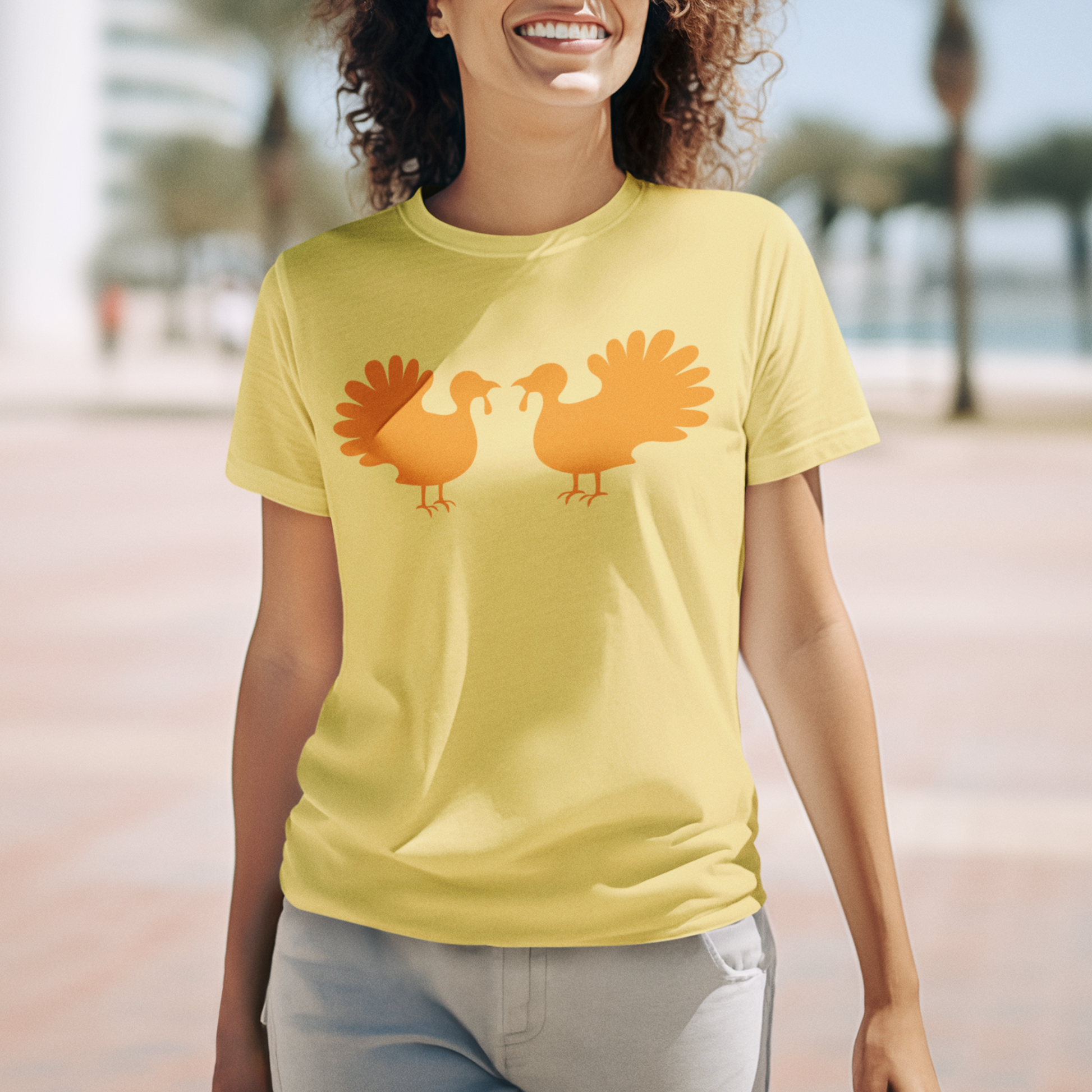 Add a playful touch to your fall wardrobe with the Turkey Talk Graphic Tee. Featuring a cheeky mirrored turkey design, this tee doubles the fun and brings festive spirit to any occasion. Perfect for celebrating the season with humor and style.