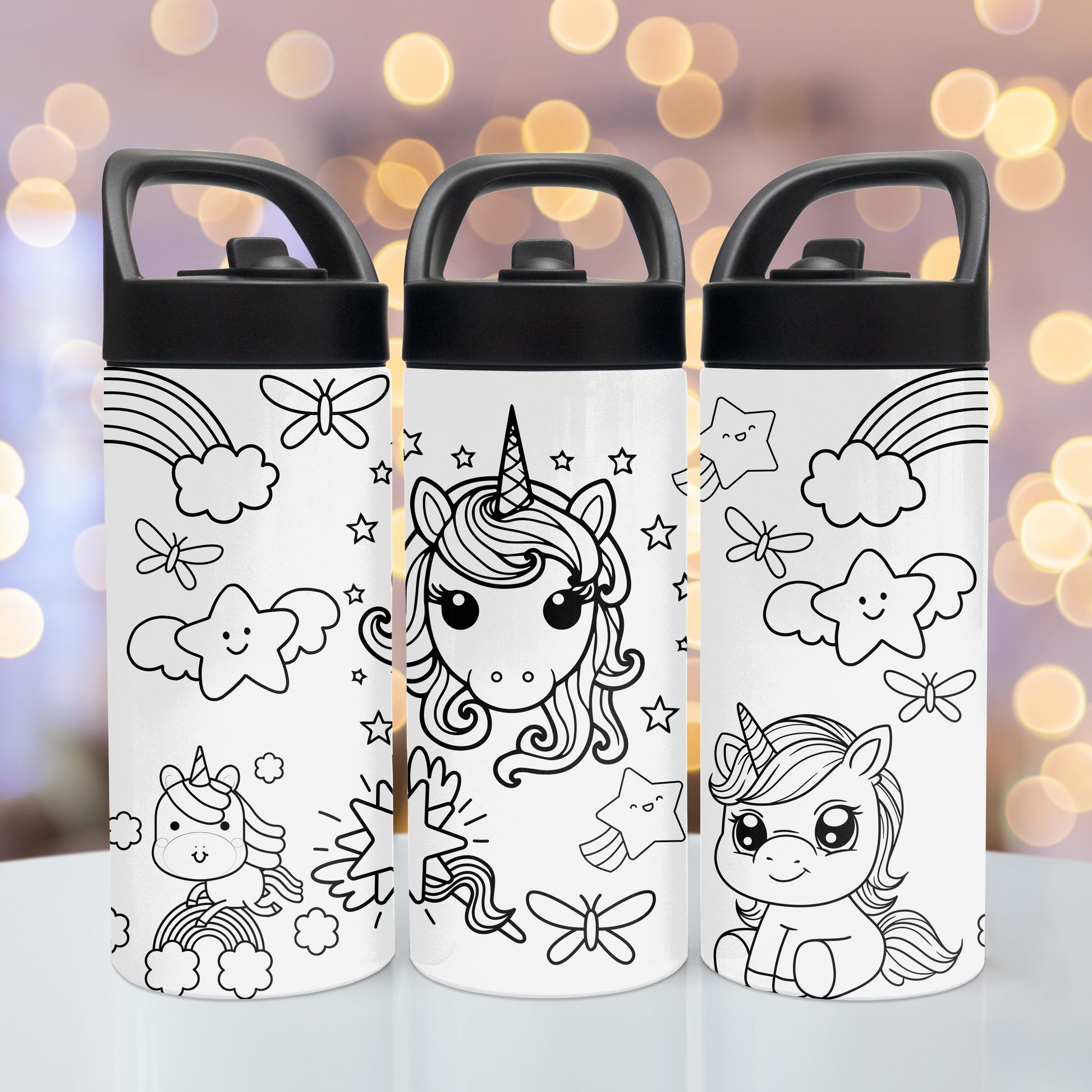 Bring creativity and whimsy to life with this enchanting **coloring tumbler**! Adorned with playful unicorns, rainbows, and stars, this tumbler is perfect for little dreamers who love to express themselves. Kids can personalize it with their favorite colors, turning it into a one-of-a-kind masterpiece they’ll love to show off.